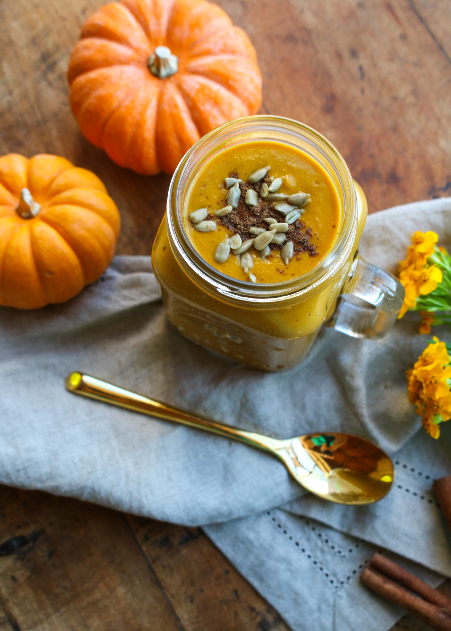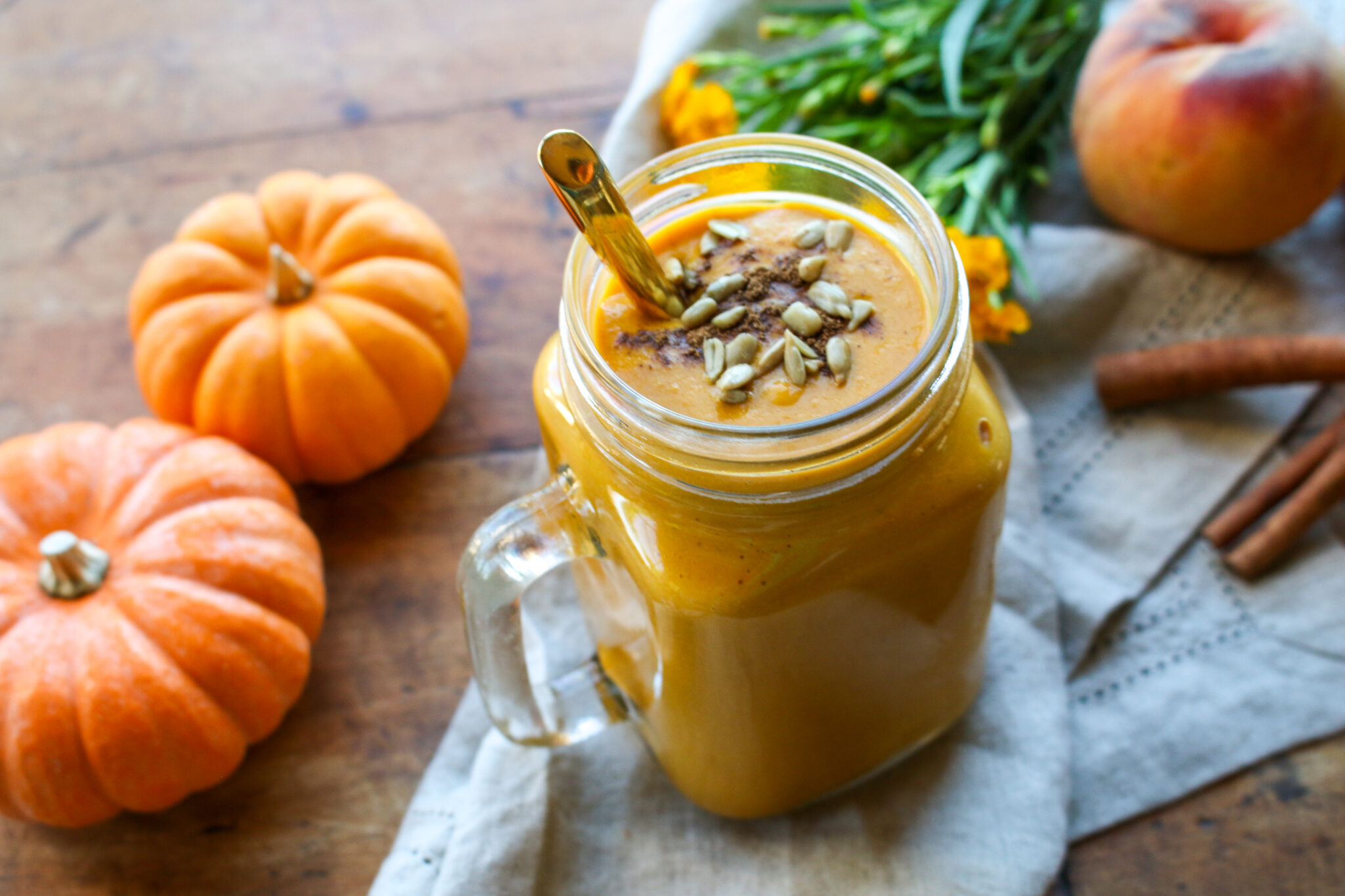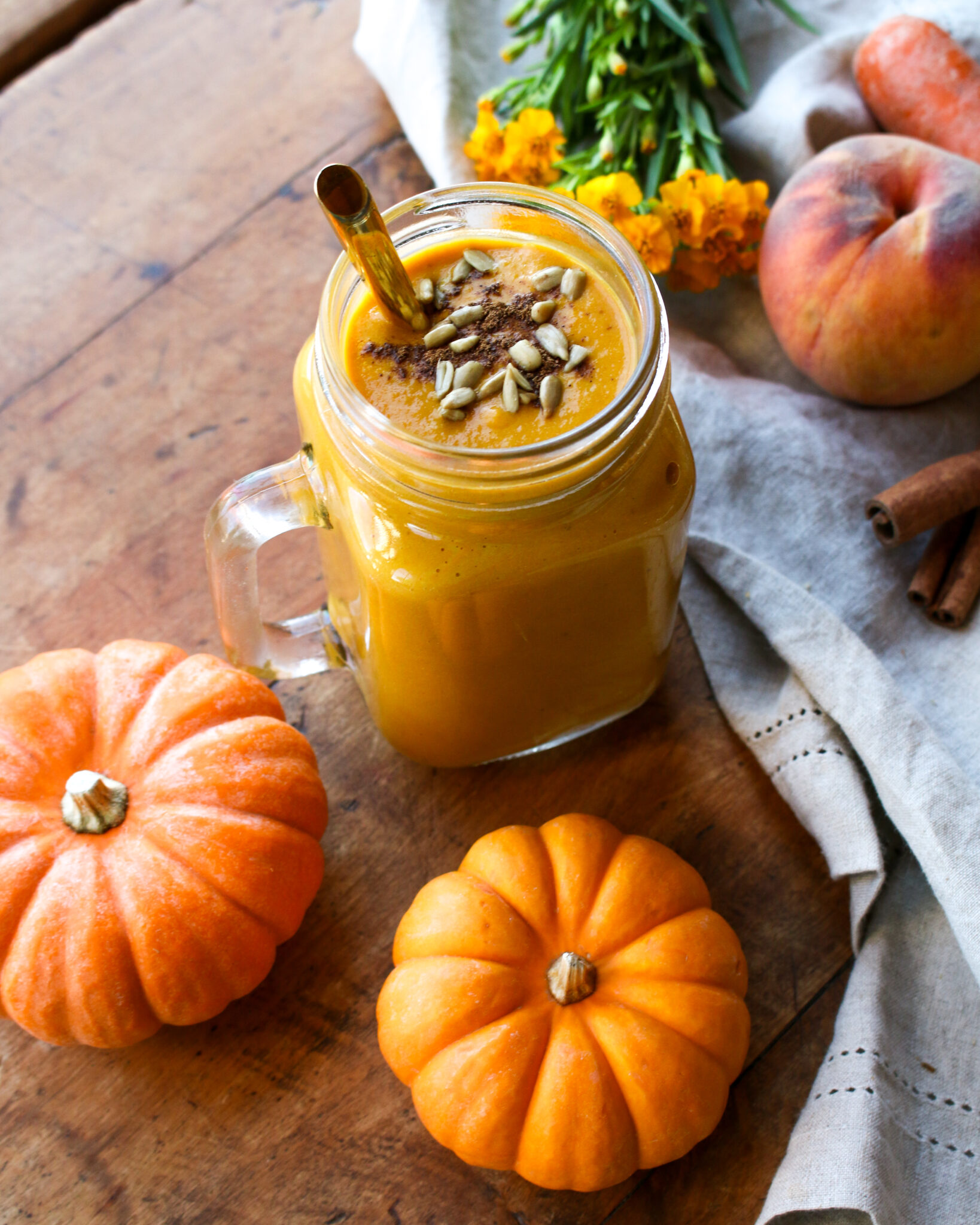 Make a Sunny Peach Pumpkin Smoothie to brighten up any day with health and flavor. Filled with carrots, peaches, sunflower seeds, pumpkin, and spice, this vegan pumpkin smoothie is just so good.