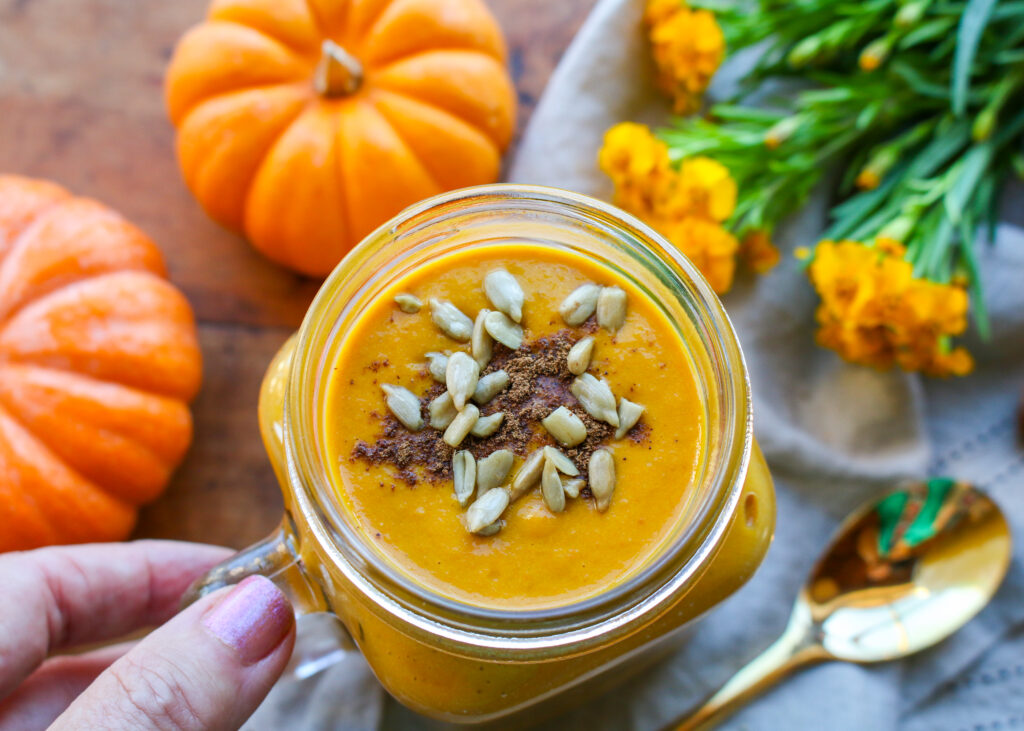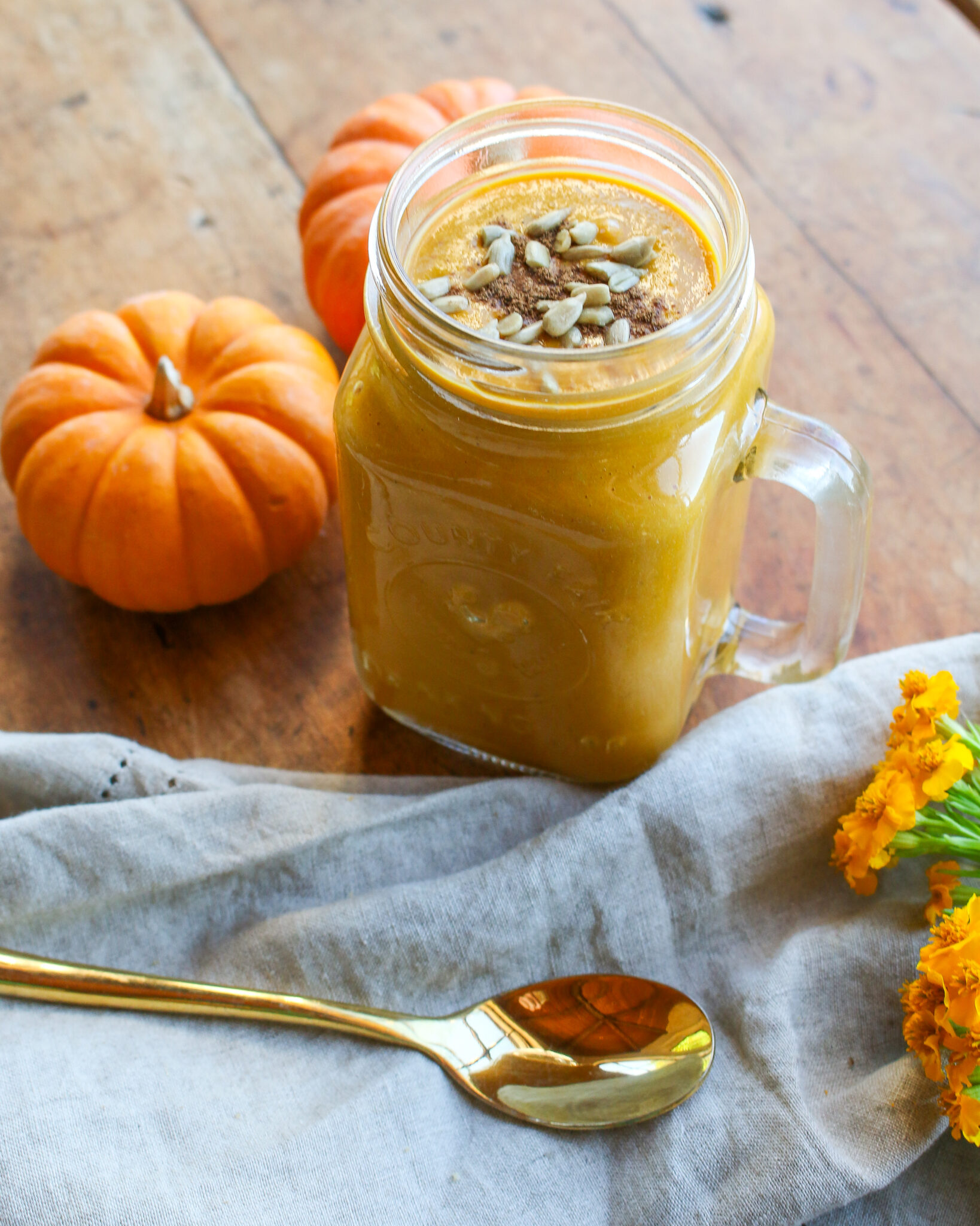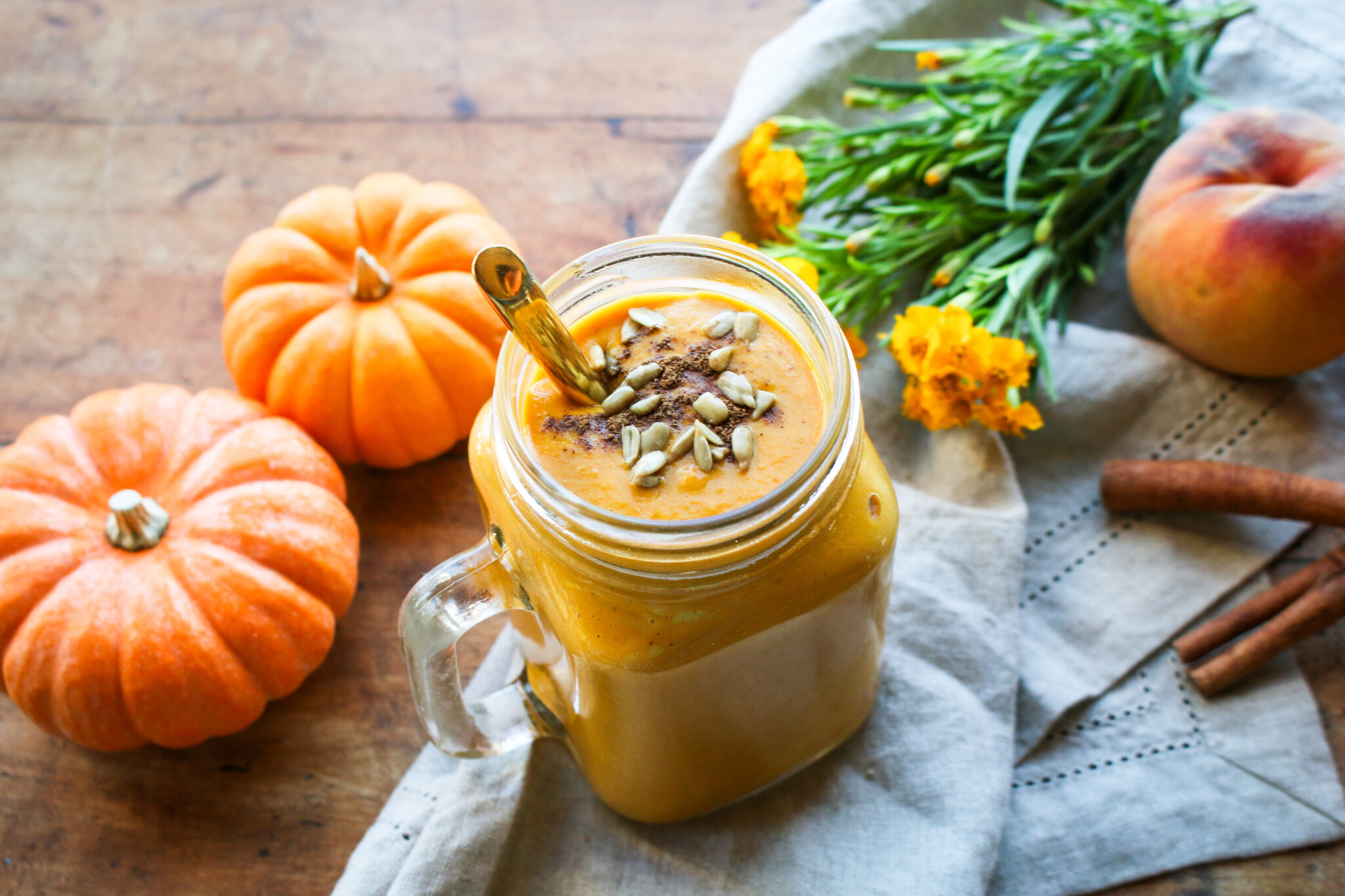Make a Sunny Peach Pumpkin Smoothie to brighten up any day with health and flavor. Filled with carrots, peaches, sunflower seeds, pumpkin, and spice, this vegan pumpkin smoothie is just so good.