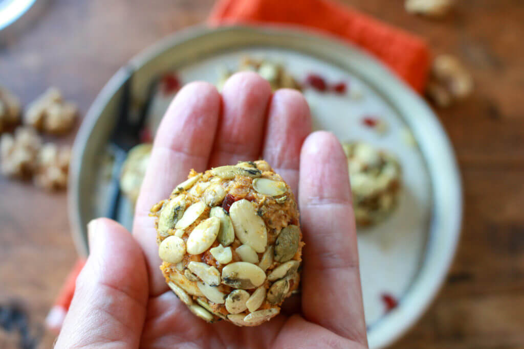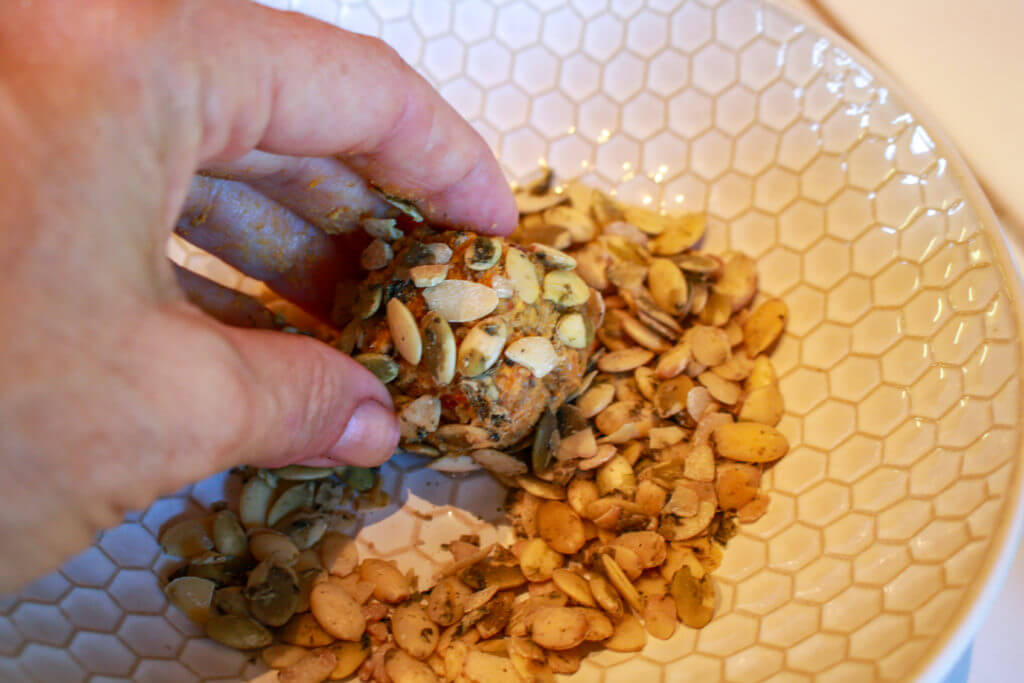 - Place 1/3 cup pumpkin seeds in a small dish and roll each ball into the pumpkin seeds to coat.