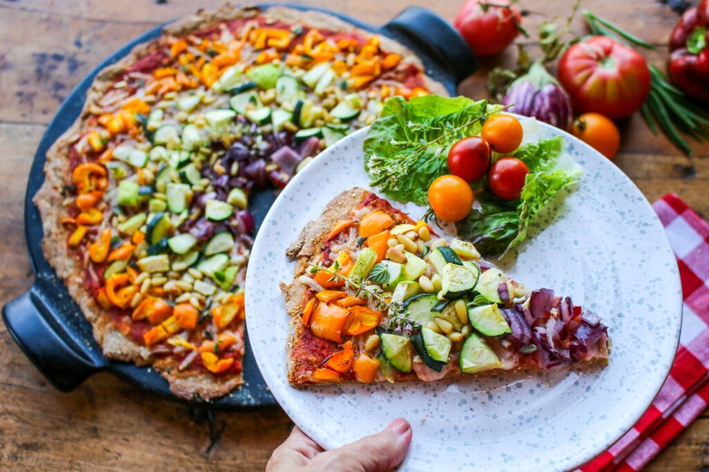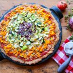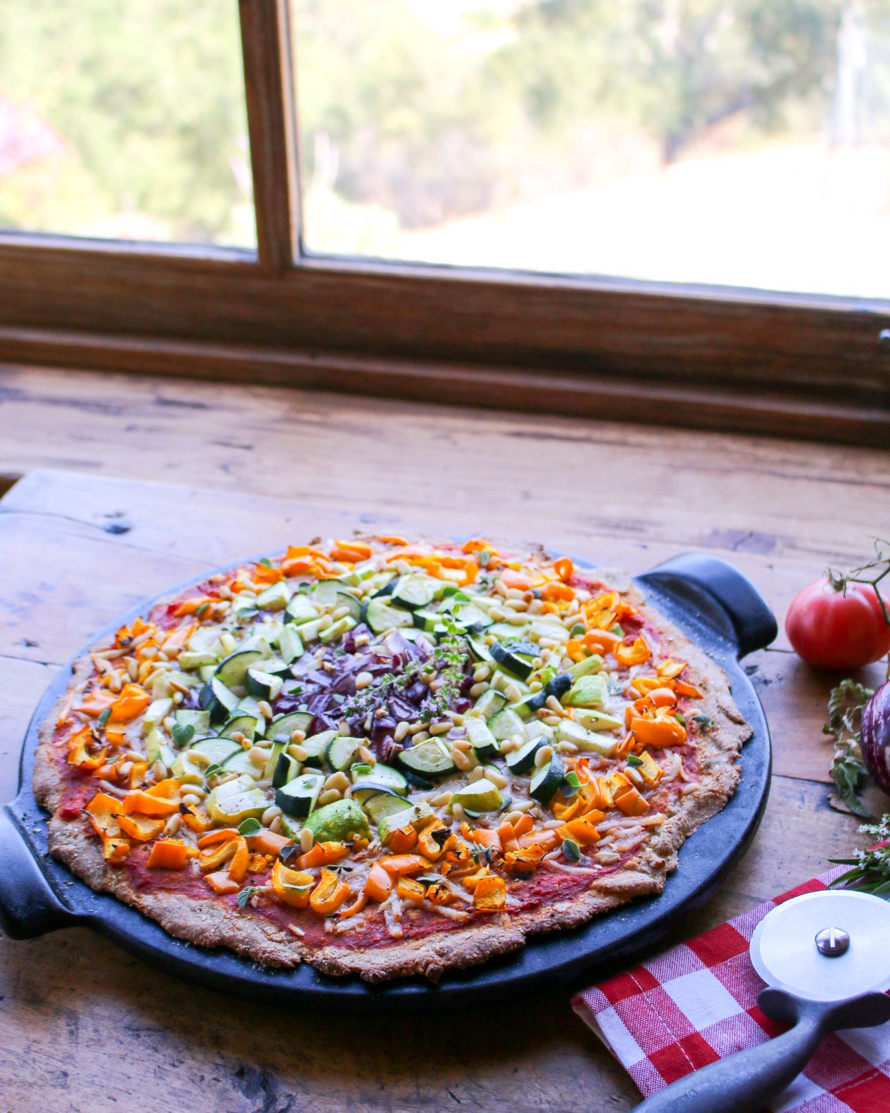 Make this gorgeous, healthy Vegan Rainbow Veggie Pizza with Cornbread Crust with a rainbow of colorful veggies, a crispy whole grain crust, plant-based cheese, and fresh herbs.