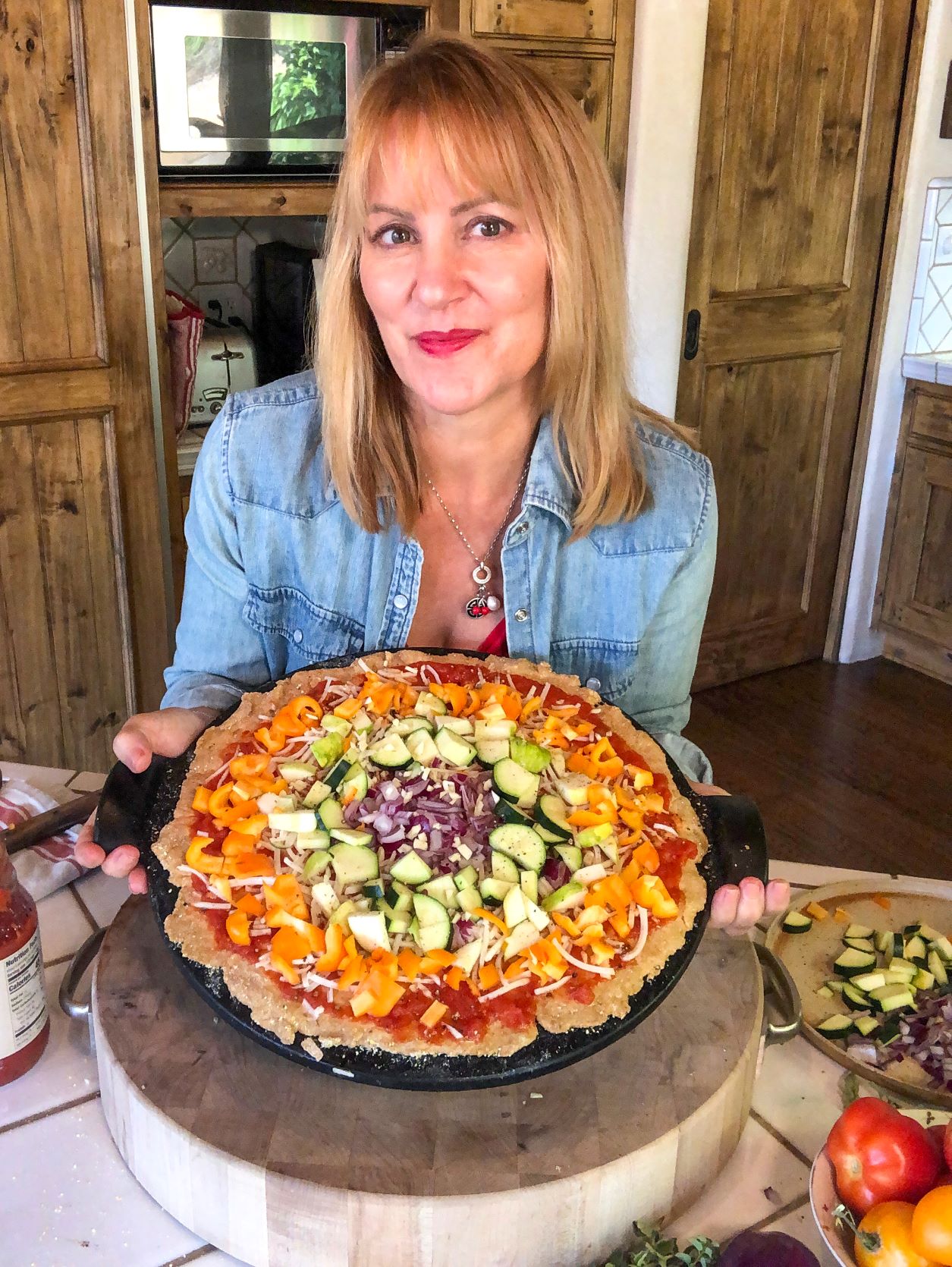 - On each pizza, encircle the red onions with a circular row of chopped zucchini, then chopped yellow squash, then chopped orange bell pepper, dividing them equally among both pizzas.