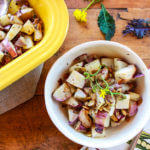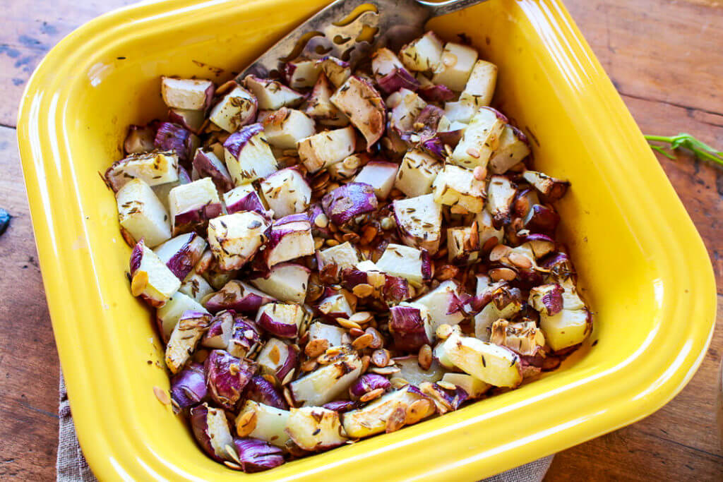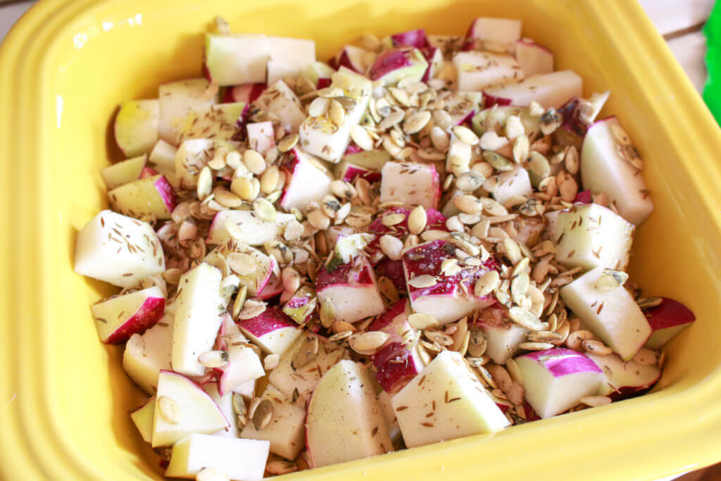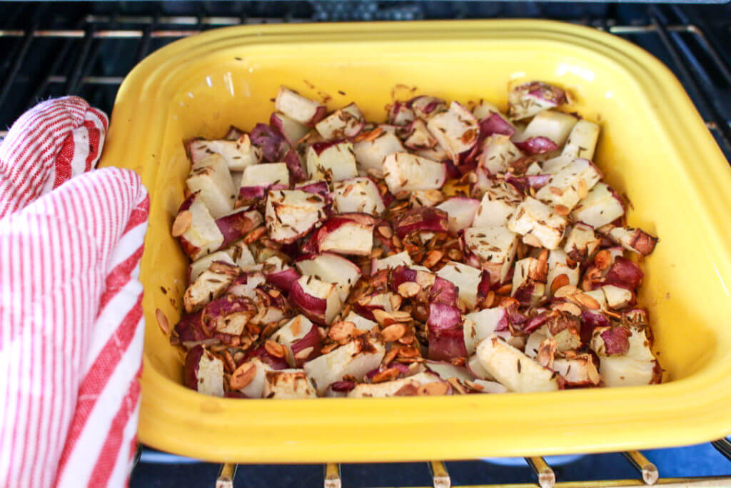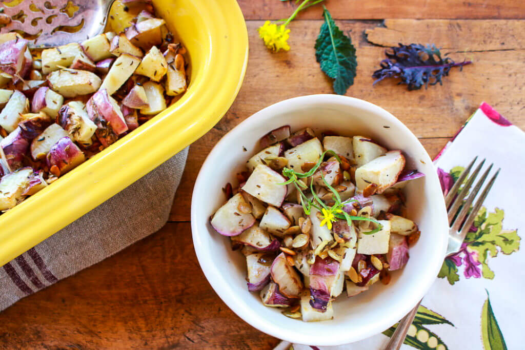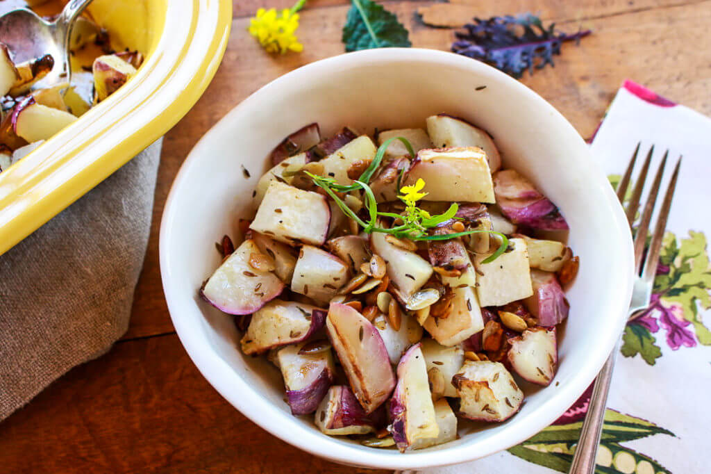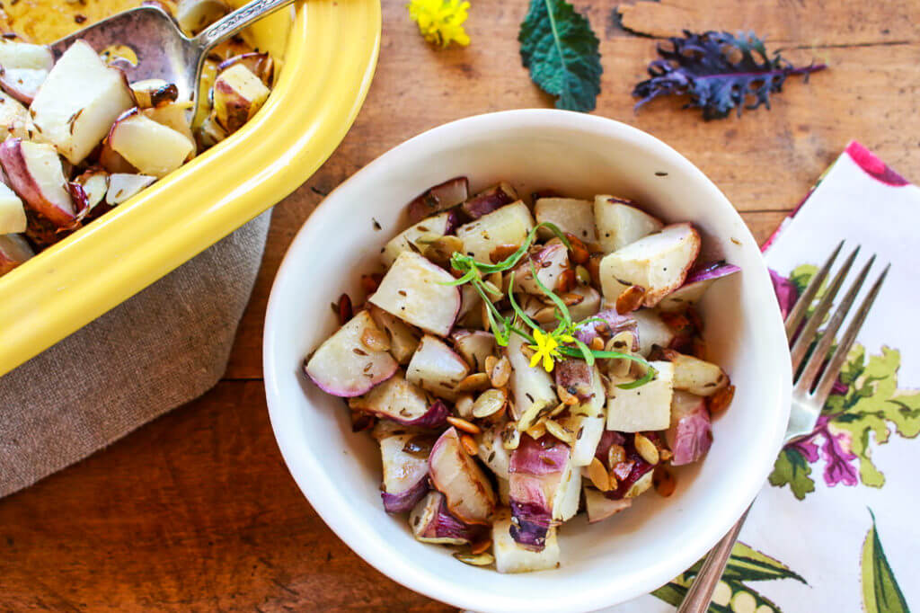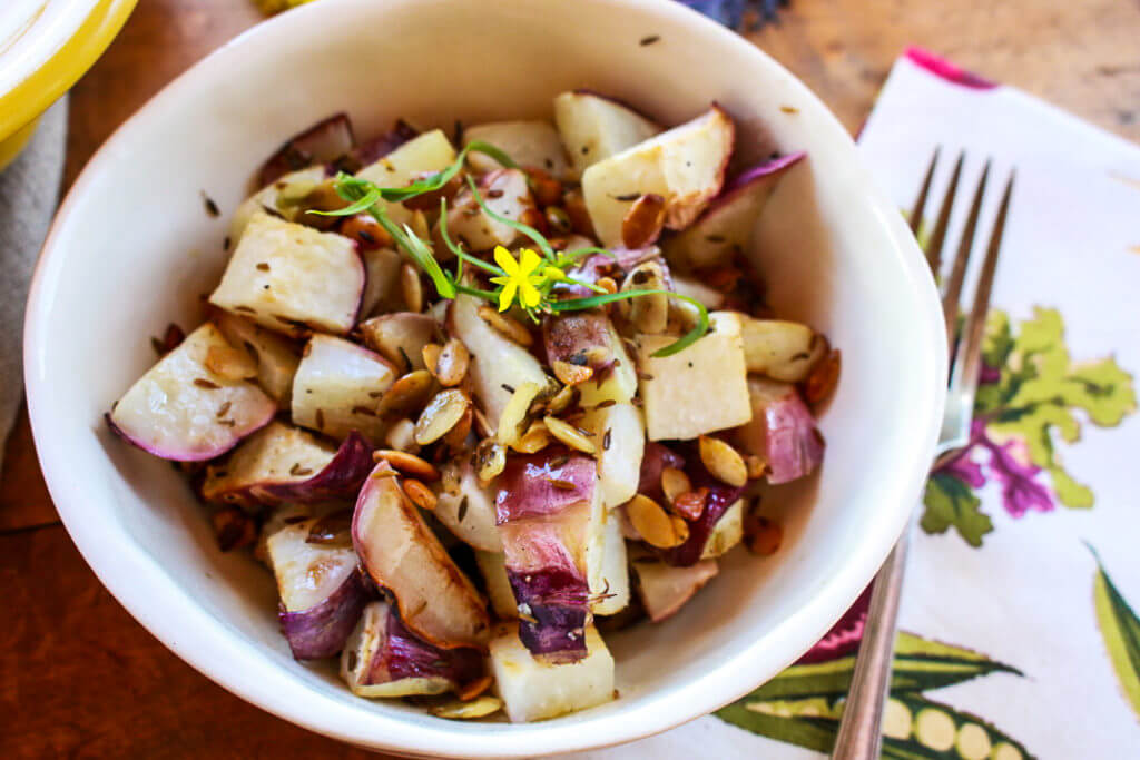 Simply chop up super nutritious kohlrabi and toss it with cumin seeds, garlic, olive oil, vinegar, and pumpkin seeds and roast it until it’s crispy good in this easy recipe.