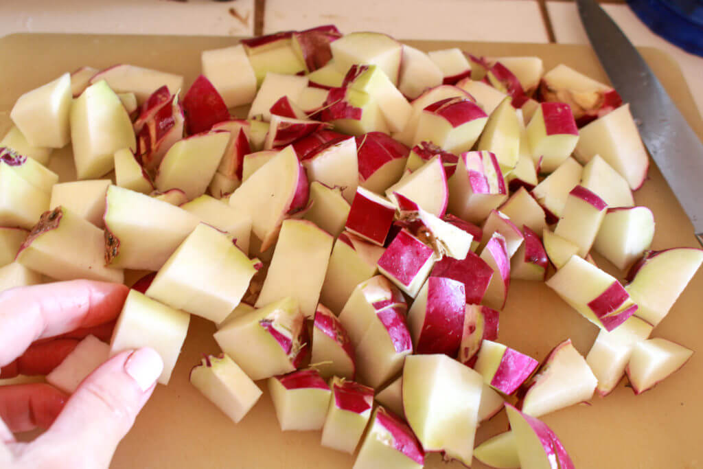 - Slice kohlrabi into small chunks. Place in a small 9 X 9 inch baking dish.