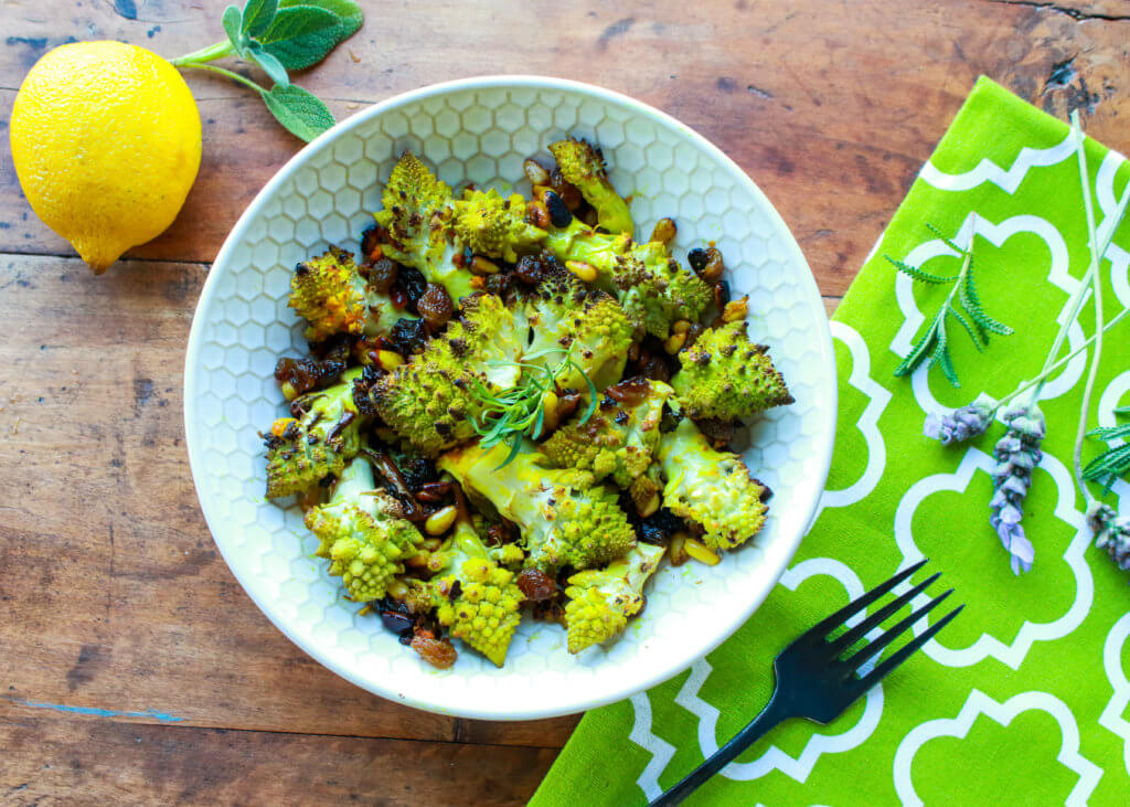 Turn the magical, geometric beauty of Romanesco cauliflower into a simple, rustic vegan, gluten-free veggie side dish in this recipe for Roasted Romanesco Cauliflower with Raisins and Pine Nuts.