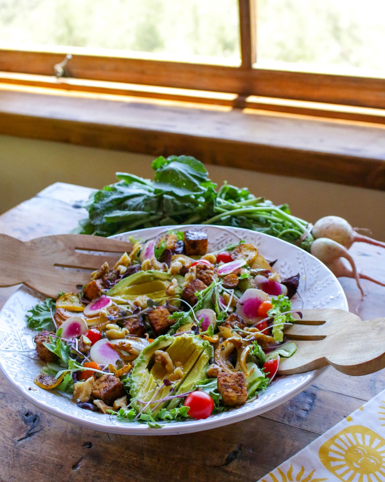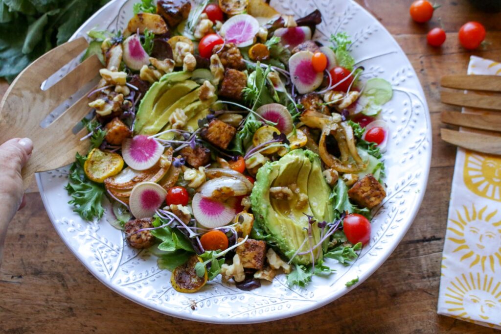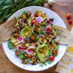 This Roasted Tempeh Summer Salad, which is rich in protein, fiber, and nutrients, is all about packing on the seasonal produce—tomatoes, cucumbers, summer squash, avocados, radishes, herbs, and hearty greens. The vegan salad is satisfying and hearty—make it gluten-free by choosing gluten-free tempeh.