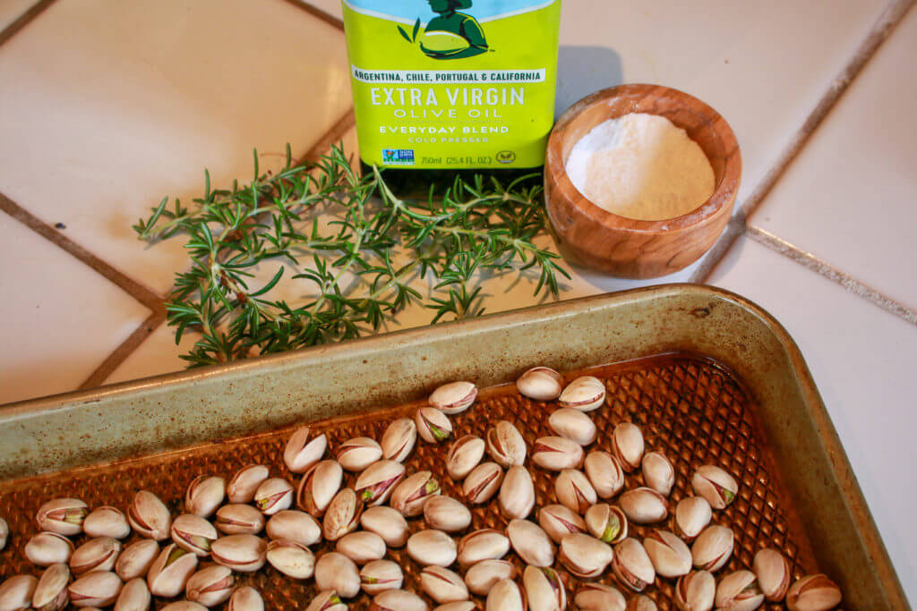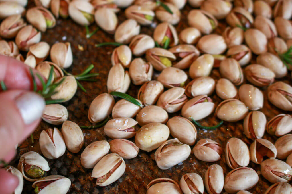 - Place a single layer of pistachios in a baking pan and sprinkle with rosemary and salt.