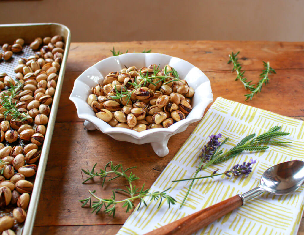 Make these quick and easy Rosemary Roasted Pistachios at home for a delicious snack or special gift.