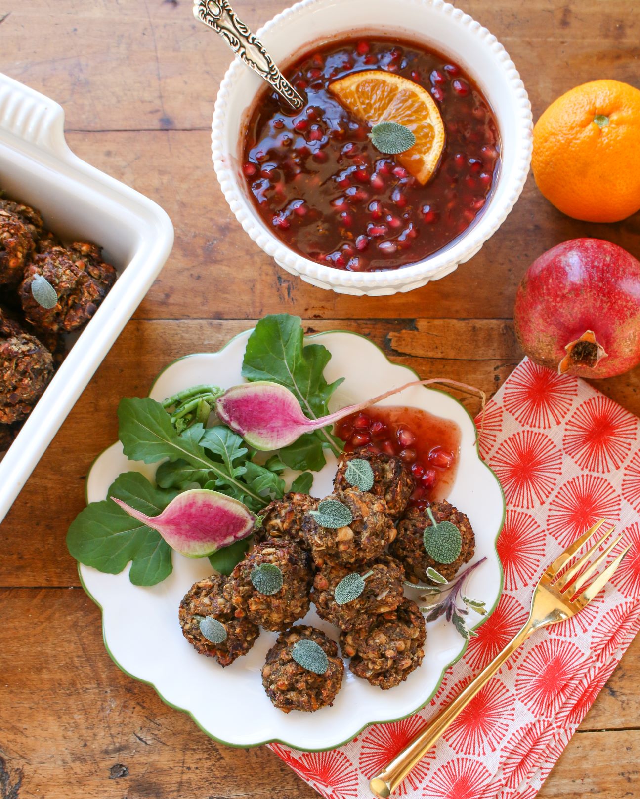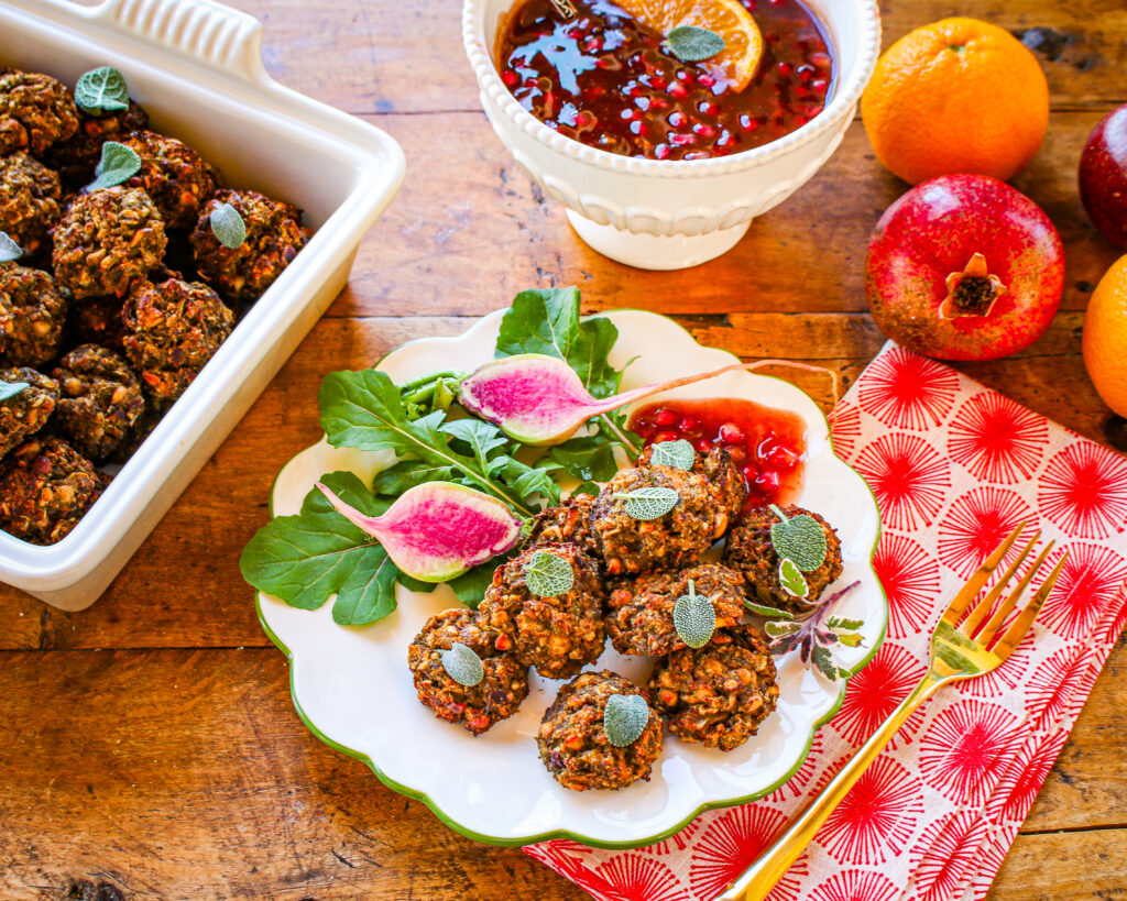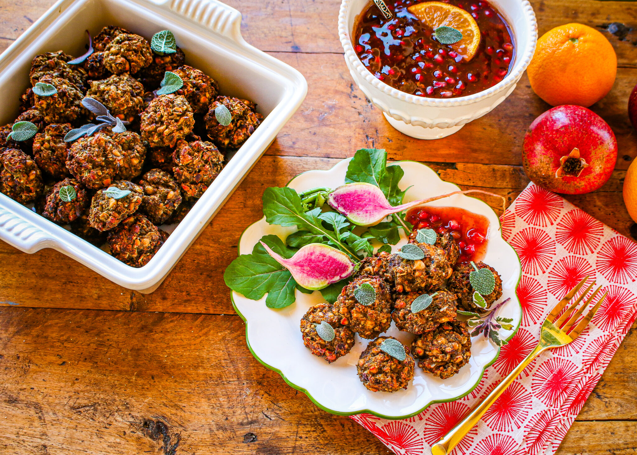 These savory, delicious White Bean Sage Vegan Meatballs are filled with the goodness of beans, sweet potatoes, mushrooms, hazelnuts, and sage. Serve them as an entrée with this flavorful pomegranate mandarin sauce.