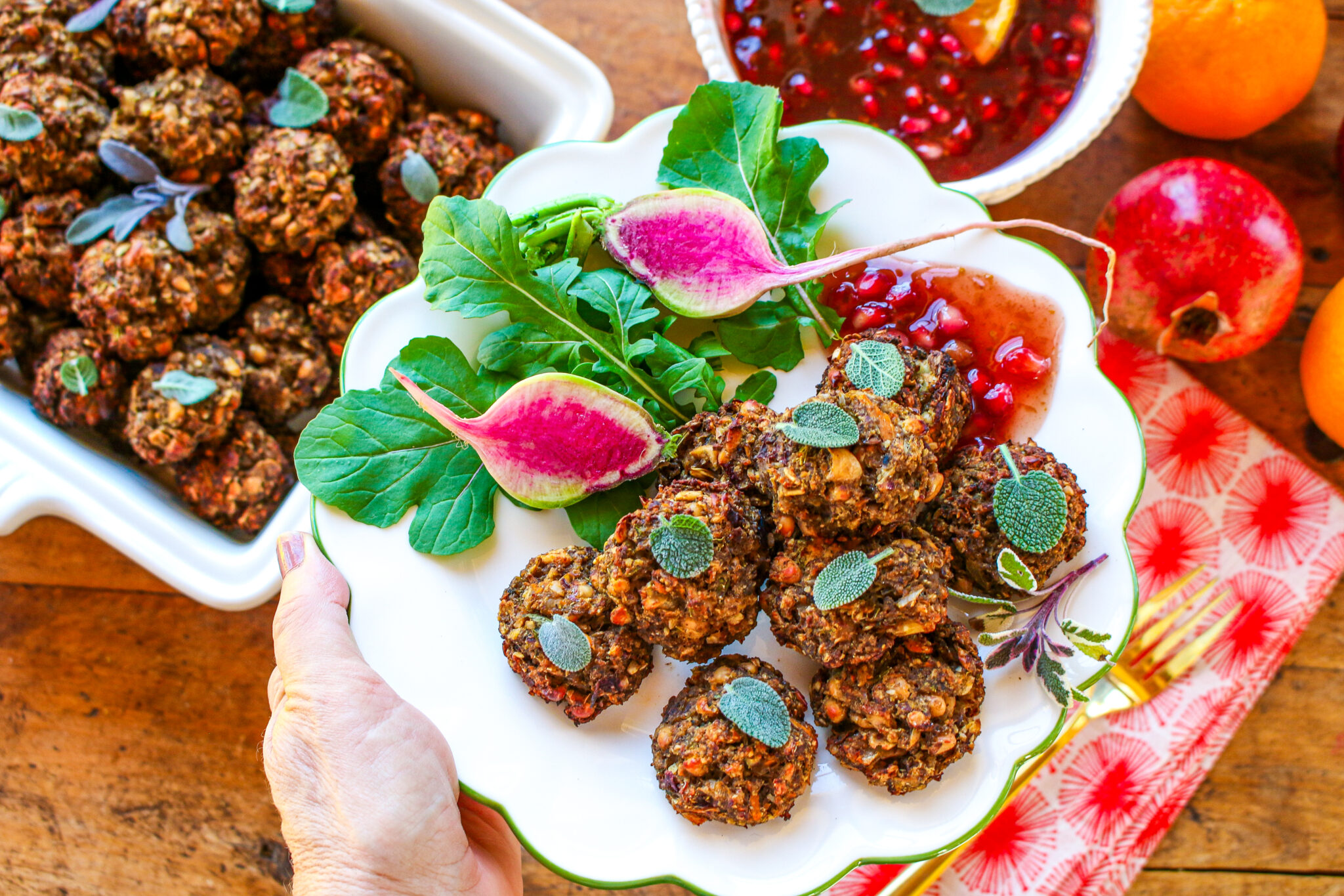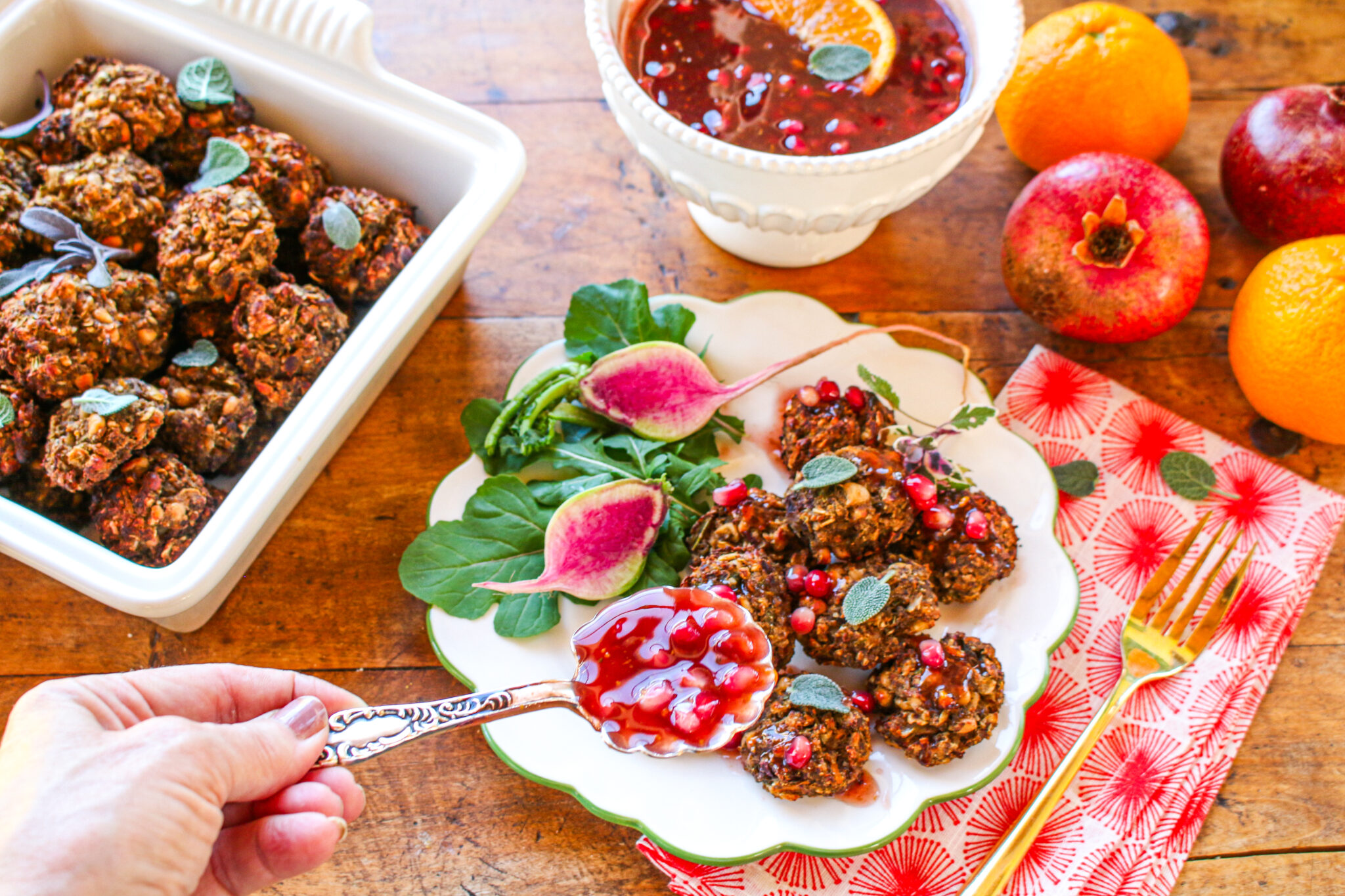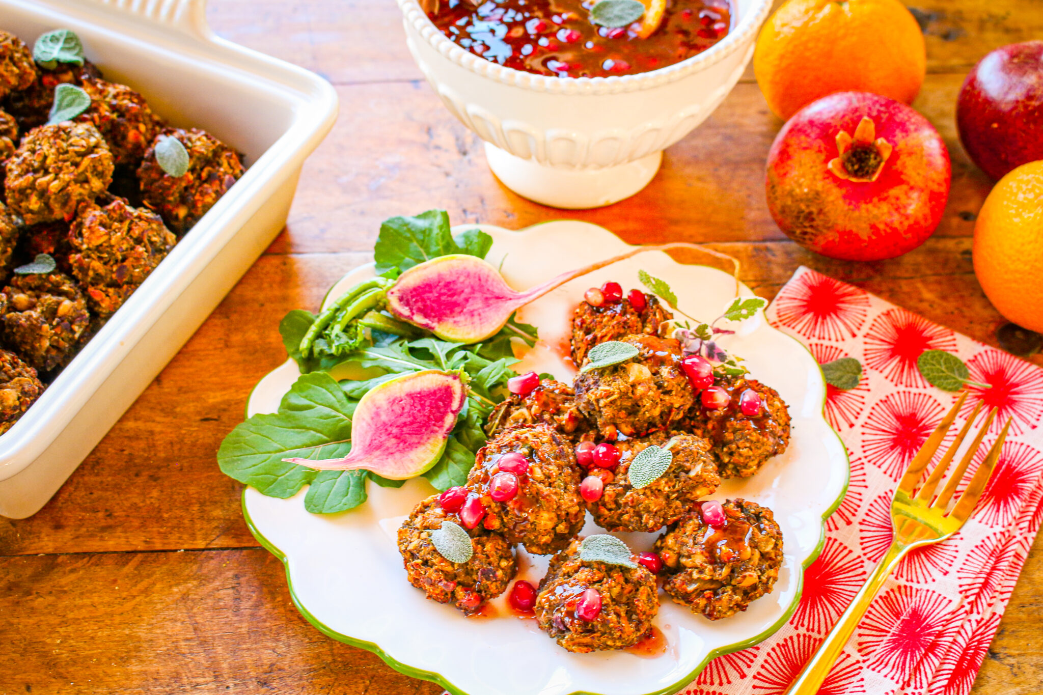 Sage White Bean Vegan Meatballs with Pomegranate Sauce (Festive Plant-Based Main Dish)