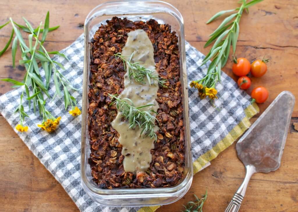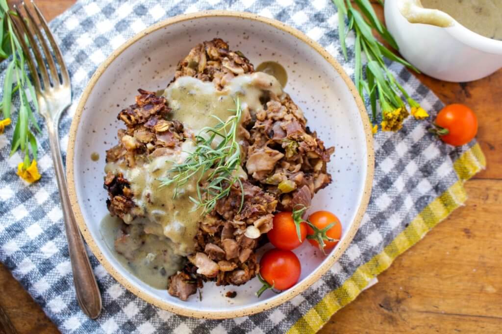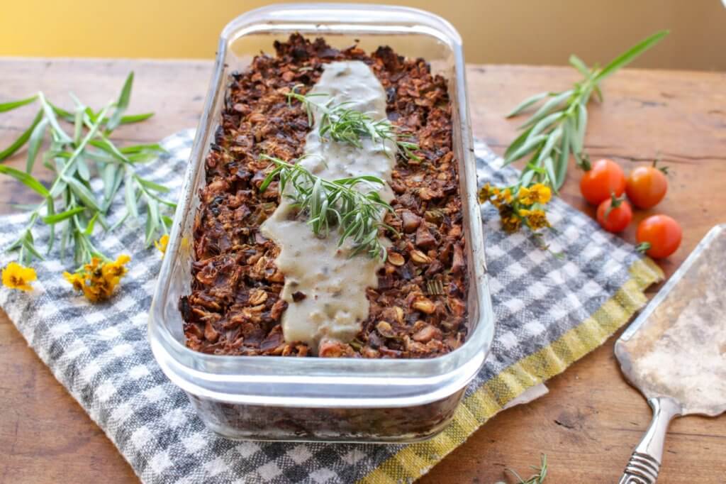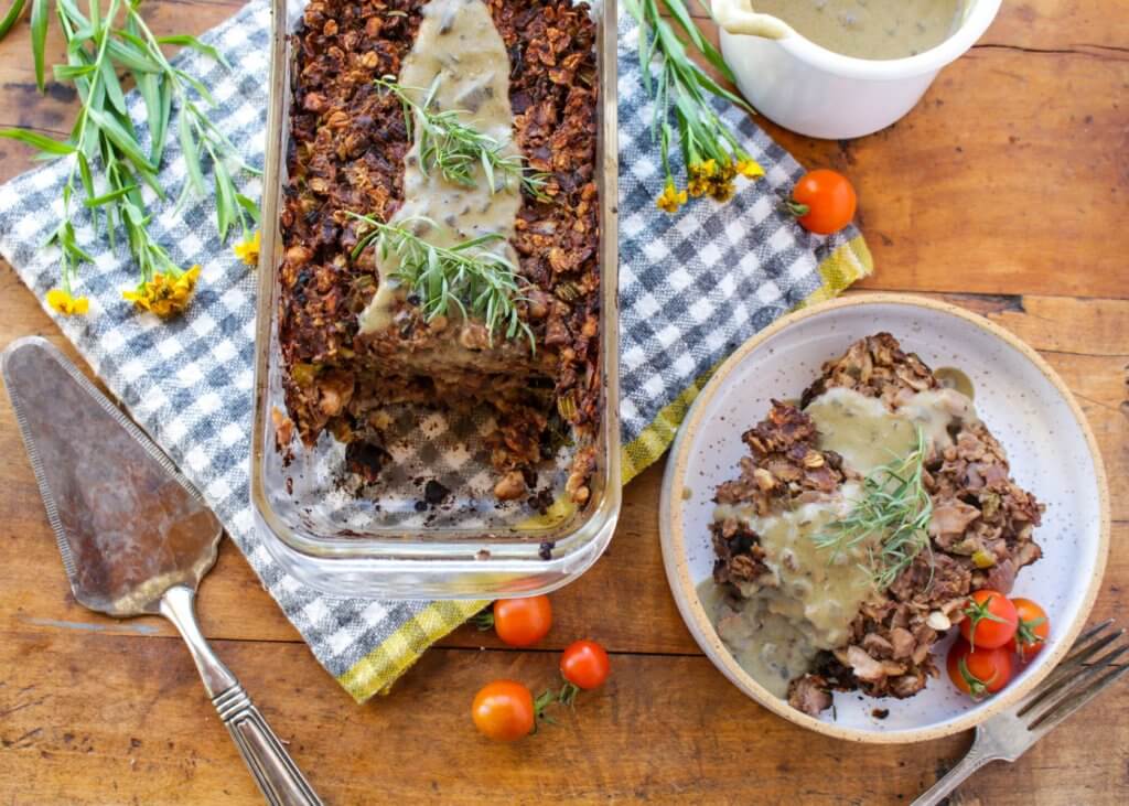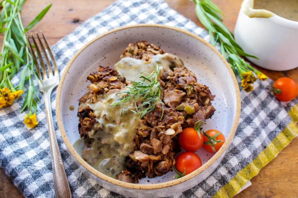 Rich with the umami flavor of onions, as well as earthy white beans, flavorful onions, garlic, and celery, and a boost of onions, flax seeds, and herbal tarragon, this Savory Tarragon Mushroom Loaf is a great way to skip the “meat” in your next vegan meatloaf.