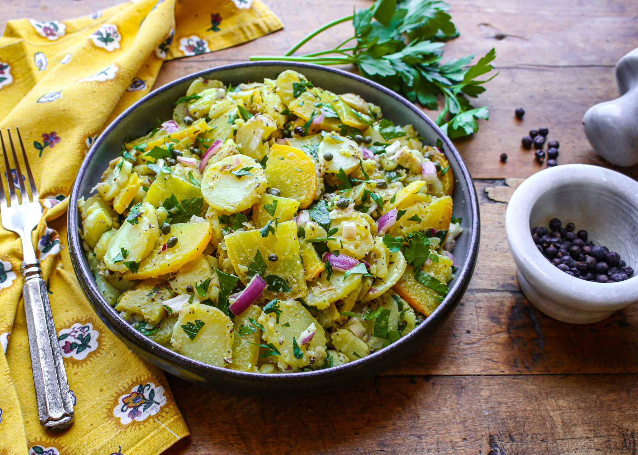 - Add the cooled, sliced potatoes and beets to the large bowl with onion mixture. Gently mix, being careful not to crush the potatoes and beets.
