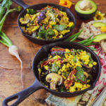 This recipe for Turmeric Tofu Scramble with Greens pairs zesty seasonings with green onions, garlic, mushrooms, leafy greens, and sun-dried tomatoes. With only 9 ingredients (not including pantry staples), you can get this breakfast tofu recipe on the table in under 20 minutes. Serve it with avocado and rustic whole grain toast for breakfast, brunch, or even dinner. I love to use whatever greens I have growing in my garden, whether it be spinach, kale, chard or mustard greens, and you can look for whatever greens are seasonal for you.