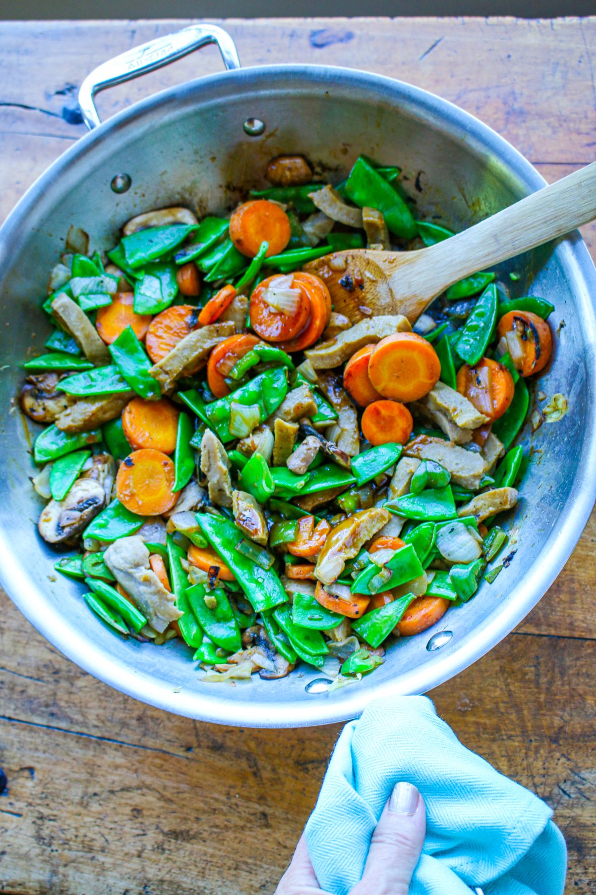 Add the mushrooms, snow peas, and seitan, and sauté for an additional 3 minutes.