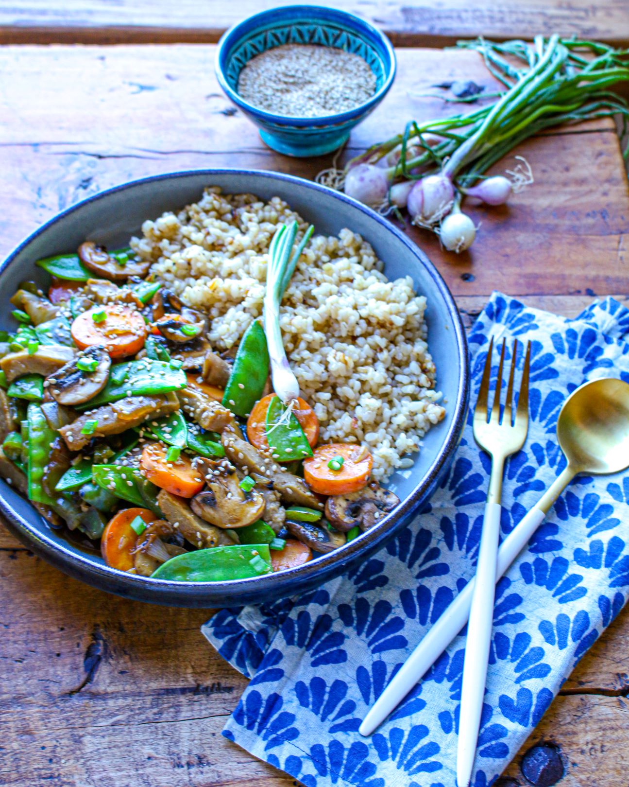 This Snow Peas and Seitan Vegetable Stir Fry with brown rice calls upon seitan to provide a savory, protein-rich touch, along with the crunch of snow peas, carrots, and peppers. This easy vegan recipe is a one-dish meal, providing sources of protein, slow-digesting carbs, and veggies all in one pan.