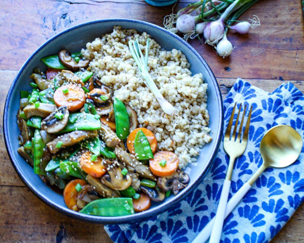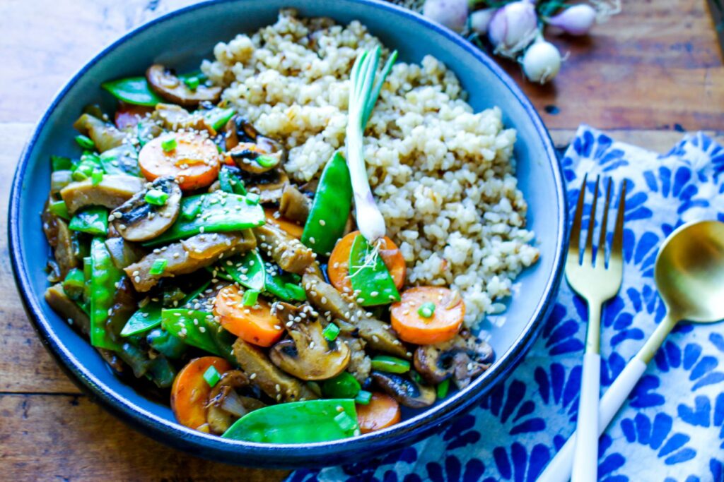 If you’re looking for a delicious, healthy, and ultimately easy plant-based (vegan) vegetable stir fry recipe, this is the dish for you! This Snow Peas and Seitan Vegetable Stir Fry served with brown rice calls upon seitan protein—a traditional wheat-based plant protein hailing from Asia—to provide a savory, protein-rich touch, along with the color and crunch of snow peas, carrots, and bell peppers. This simple, yummy stir fry recipe is a one-dish meal you can get on the table in 30 minutes, providing good sources of protein, slow-digesting carbs, and veggies all in one pan to serve over cooked brown rice. Try trading out your favorite vegetable (cabbage, zucchini, bok choy) for the snow peas for an easy twist, if you like. And you can use frozen stir fry vegetables in place of fresh to make it budget friendly, quick and easy, too.