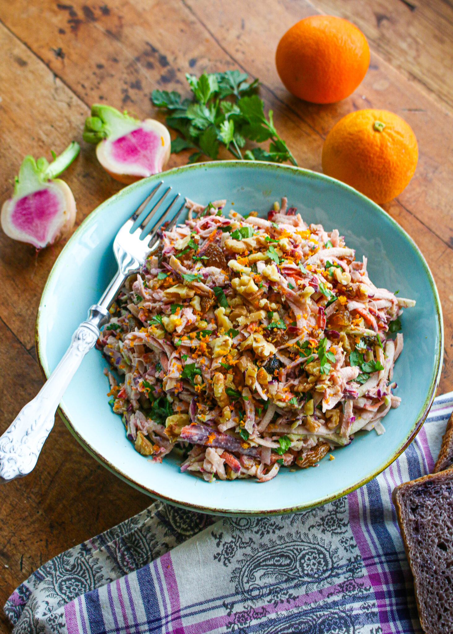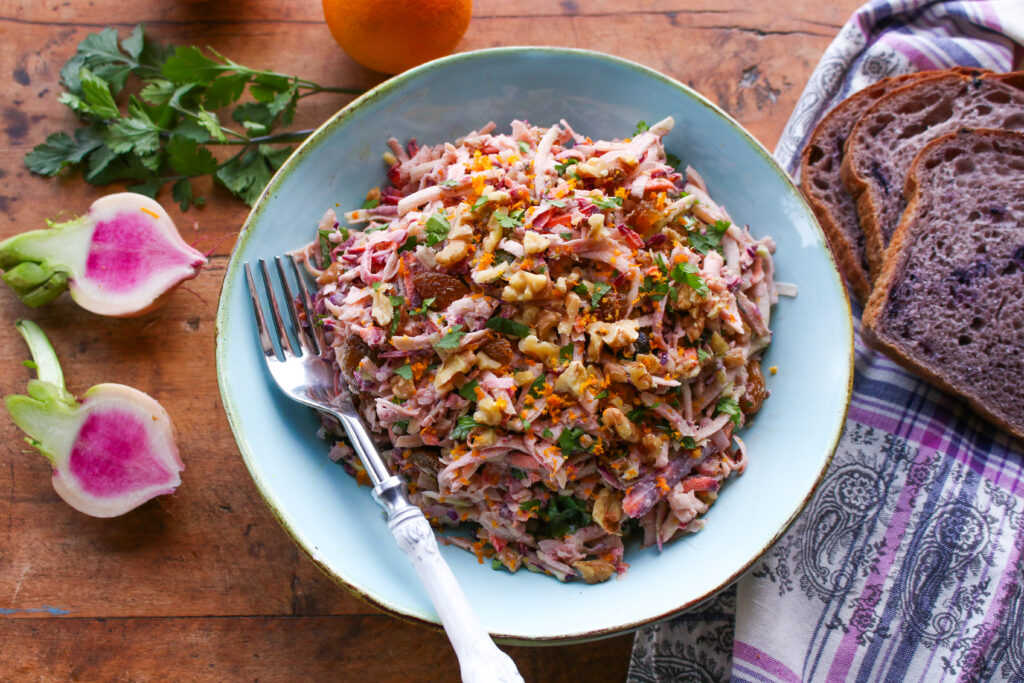 Winter-spring produce has never been prettier than in this light and lovely, pink-hued slaw, featuring kohlrabi, sweet baby carrots, and pretty pink radishes. If you’ve never tried kohlrabi, this should be your first try. This bulb is in the cruciferous family, and it is ideal in slaws and salads. Learn more about kohlrabi here. I used a food processor to shred the vegetables, but you can also use a hand held box grater. Mixed with a vegan orange dressing, golden raisins, and crunchy walnuts, this shaved kohlrabi, carrot, radish slaw aims to please.