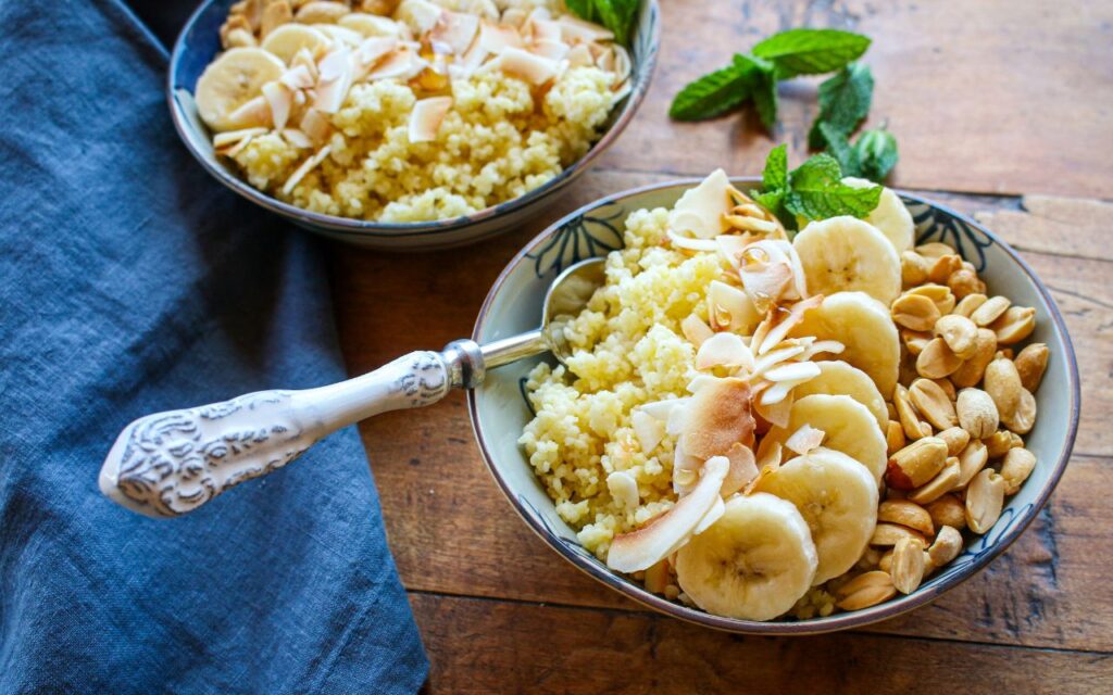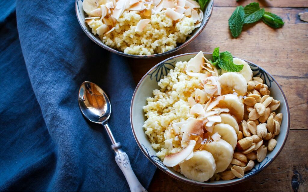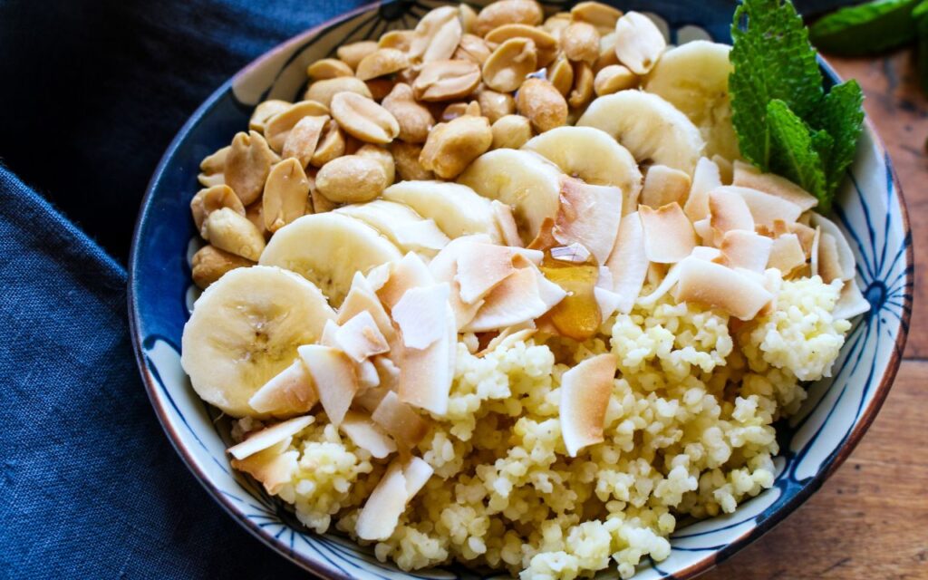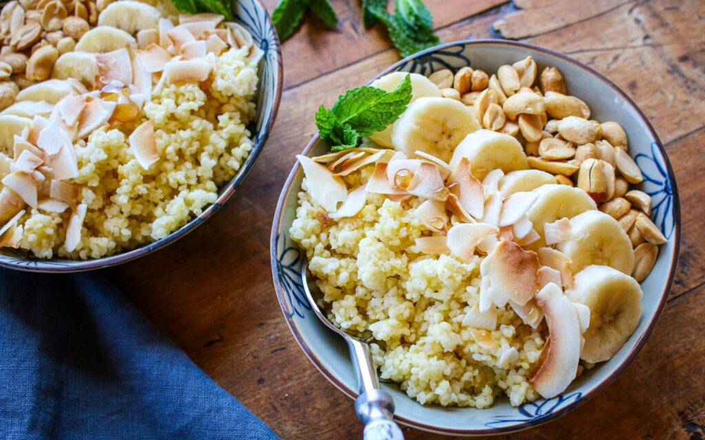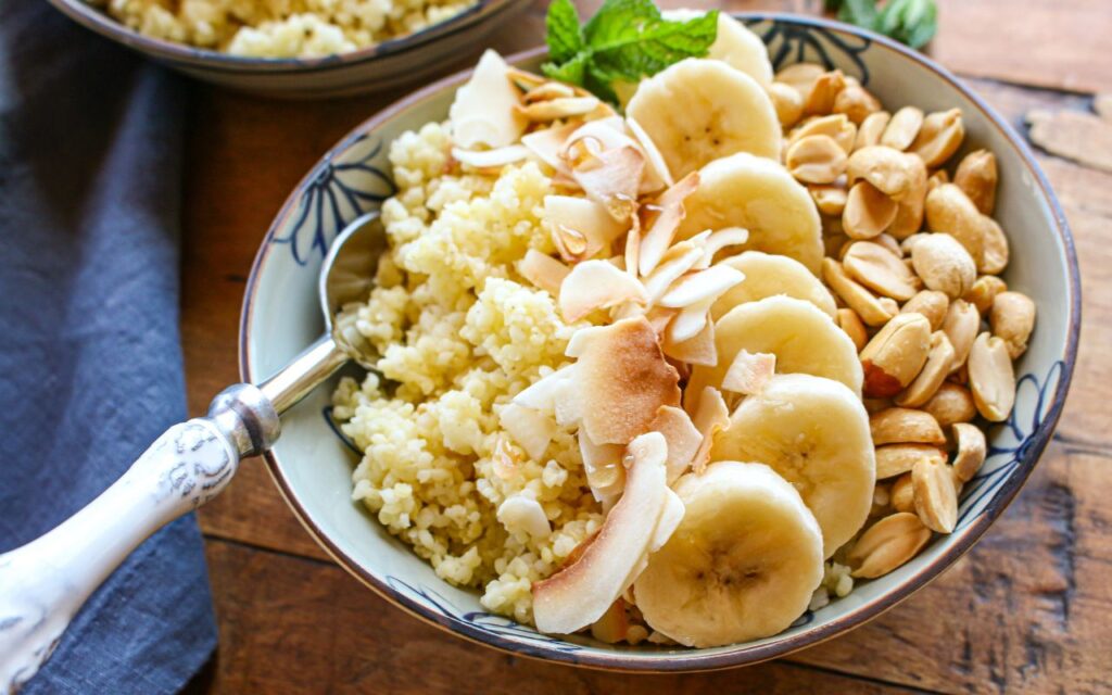 Looking for a new way to do your breakfast grain bowl? Then try a millet breakfast bowl, topped with flavorful shredded coconut, bananas, and peanuts for a powerful flavor and health bonus. This easy breakfast porridge bowl starts with quick-cooking whole grain millet, which is then topped with slices of fresh bananas, coconut, peanuts, and coconut milk beverage, with a drizzle of maple syrup. With only six ingredients, you can make these whole grain breakfast bowls in 20 minutes. This Shredded Coconut Banana Millet Breakfast Grain Bowl recipe is a perfect meal prep idea too! Just make up your whole grain millet coconut bowls in advance, prepping them in individual, microwavable containers, such as Weck glass containers, and pop them in the microwave before digging in. You can enjoy this breakfast bowl as a snack and even breakfast for dinner. Great for all ages, from kids and teenagers to adults. Substitute with other seasonal fruit, such as berries, peaches, and apples.