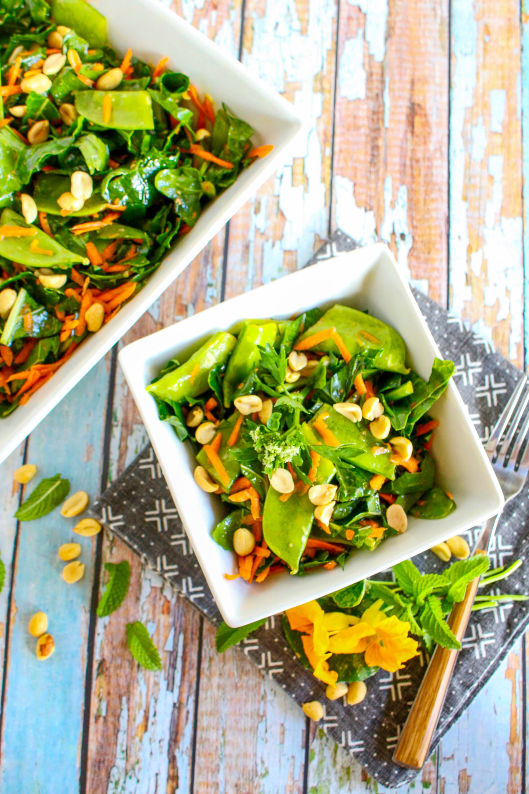 This salad is paired with crisp snow peas, crunchy carrots, nutty peas, and earthy greens—wonderful Asian ingredients you’ll find in many traditional dishes. But they work well in a fusion Western-style salad that will soon become your favorite! All you have to do is make up your vinaigrette (make up extra to enjoy later!), then toss together chopped greens, shredded carrots, snow peas, and peanuts.