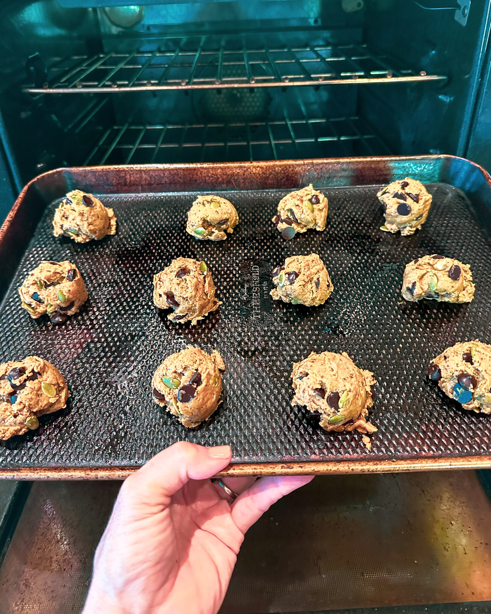 - Fold in pumpkin seeds and chocolate chips with a wooden spoon.