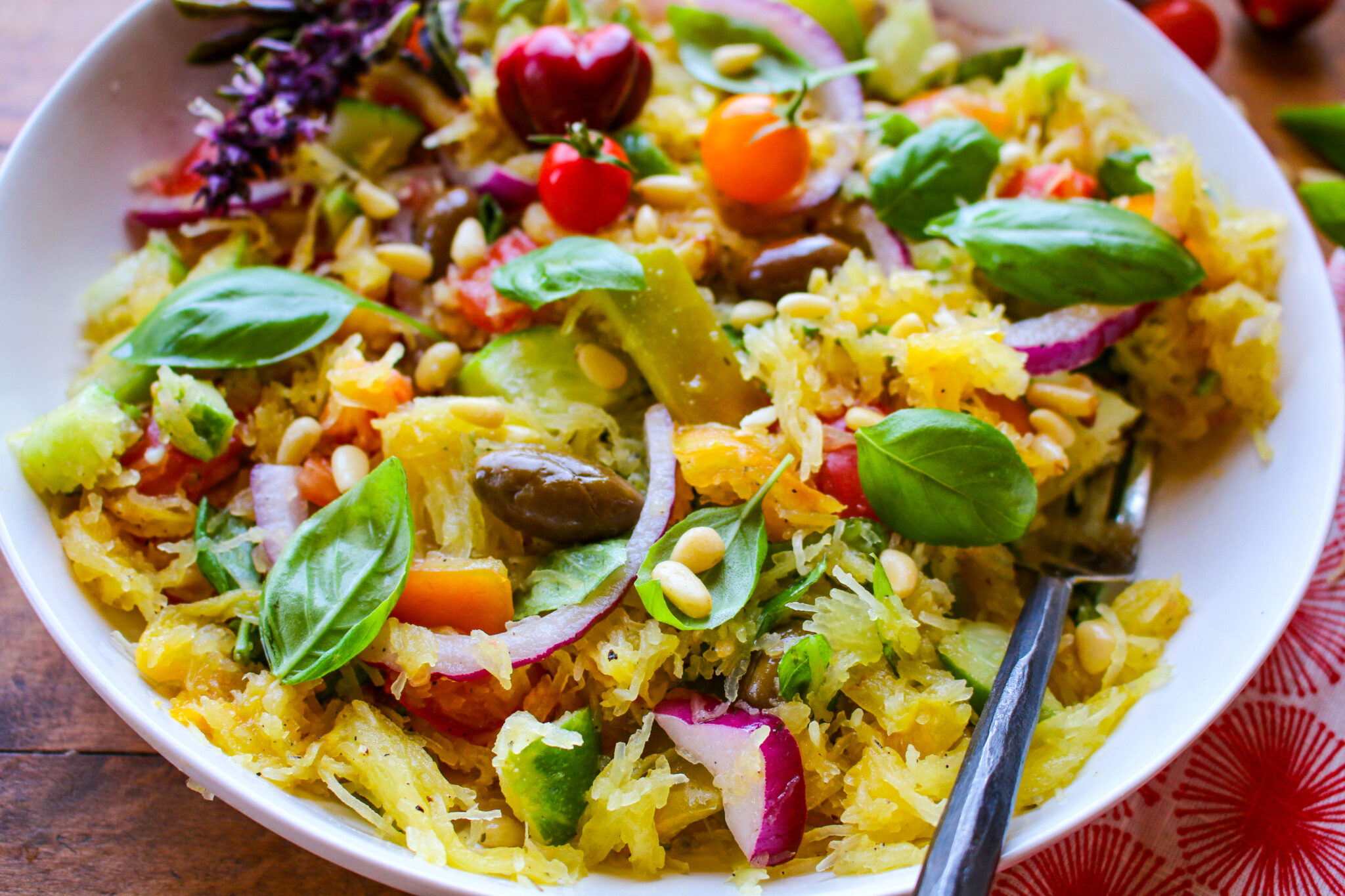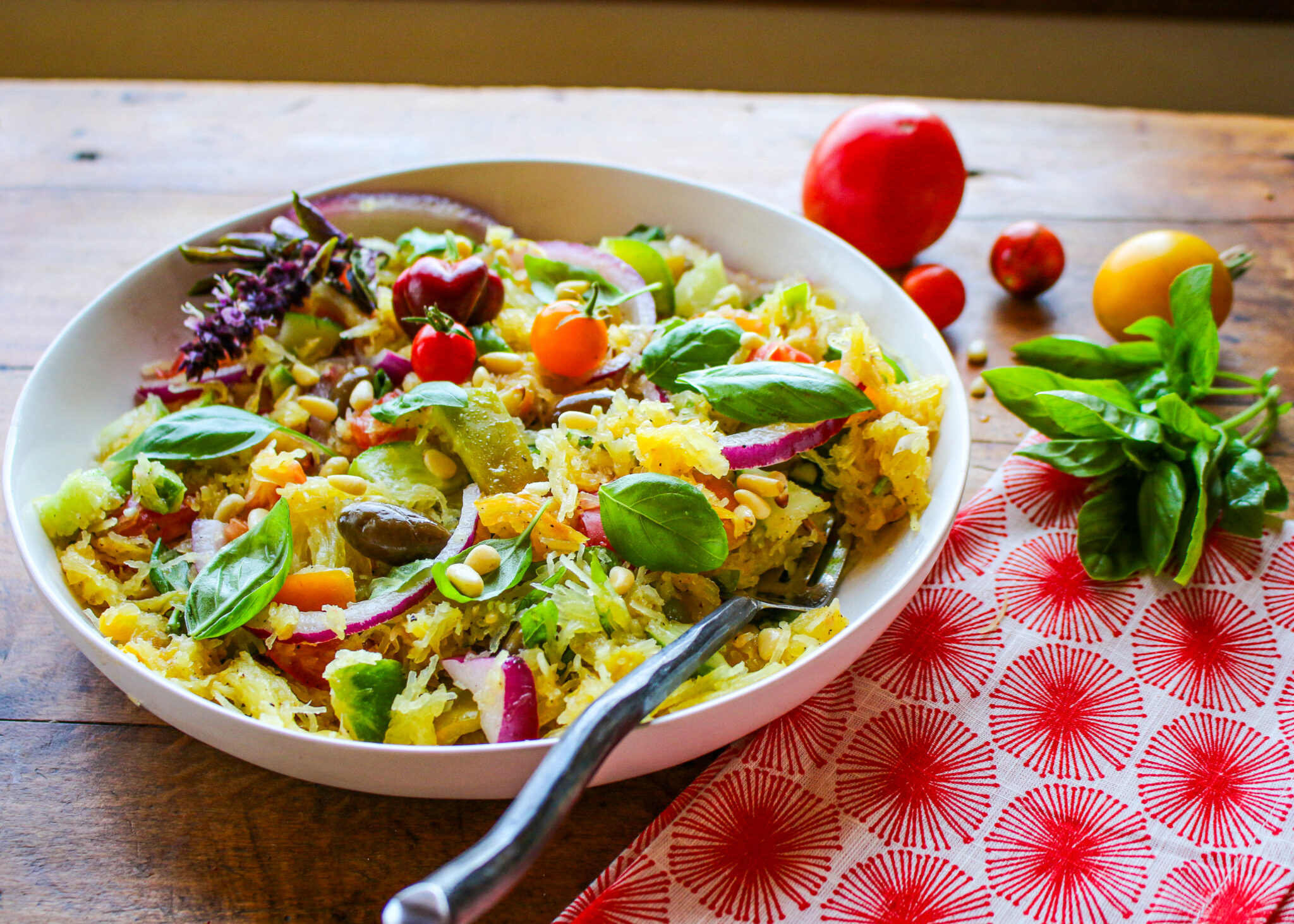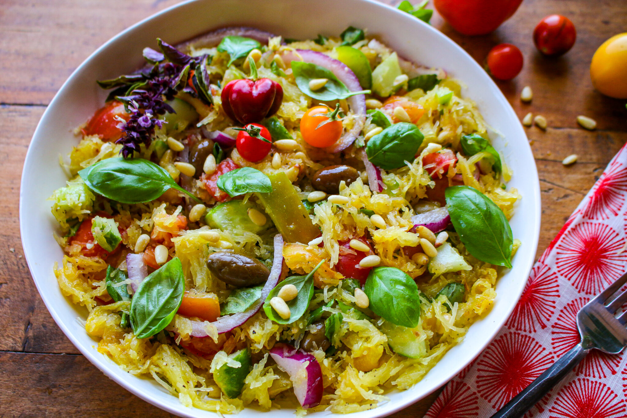 Spaghetti squash is a great replacement for pasta in dishes. Those golden, crunchy strands of squash can stand in for wheat-based pasta, to create a lower-calorie, gluten-free, plant-based (vegan) salad just shining with health benefits. In this Mediterranean inspired, colorful salad, simple roasted spaghetti squash is tossed with tomatoes, cucumbers, bell peppers, onions, olives, pine nuts, and basil, with a zesty lemon vinaigrette. Just cut up a fresh spaghetti squash into fourths, scoop out the seeds, and roast. Then cool it and fluff it into strands with a fork. Then mix in that gorgeous, colorful combo of veggies and dressing to create a powerfully delicious salad. This salad is filled with fiber, vitamins, minerals, and phytochemicals, thanks to those brightly colored vegetables. Plus, it holds up well in the fridge for a few days, as the flavors meld together and deepen. This spaghetti squash salad is fabulous served at a summer picnic or potluck, on a grill day to accompany veggie burgers, or as a simple rustic side dish for any meal.