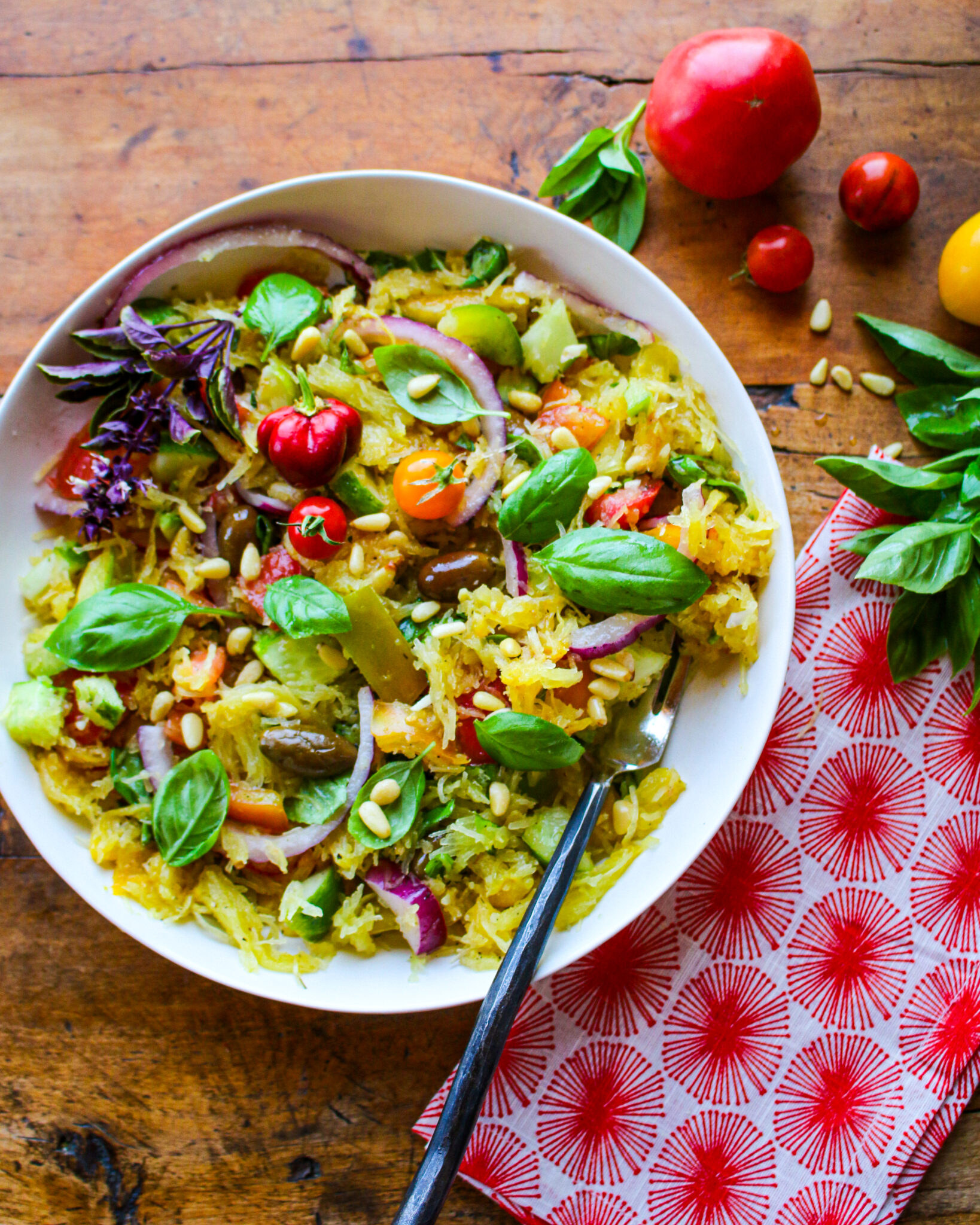 Just slice a spaghetti squash in half, then quarters, scoop out seeds with a spoon, place in a baking dish with ½-inch, water, drizzle with a bit of EVOO, and season. Roast at 375 F until just tender. This spaghetti squash I grew in my garden!When spaghetti squash is cool, flake it into strands with a fork to add to your salad. Those strands will come right off the peel!Toss spaghetti squash strands with tomatoes, cucumber, olives, onions, basil, pine nuts and the lemon vinaigrette and enjoy!