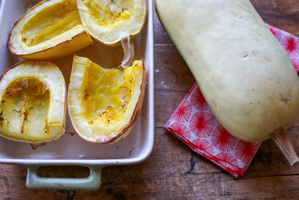 Place in the oven, uncovered, and cook just until squash is tender, and can be loosened into strands with a fork, and is cooked but not mushy (about 40-50 minutes). Remove from oven and allow to cool.