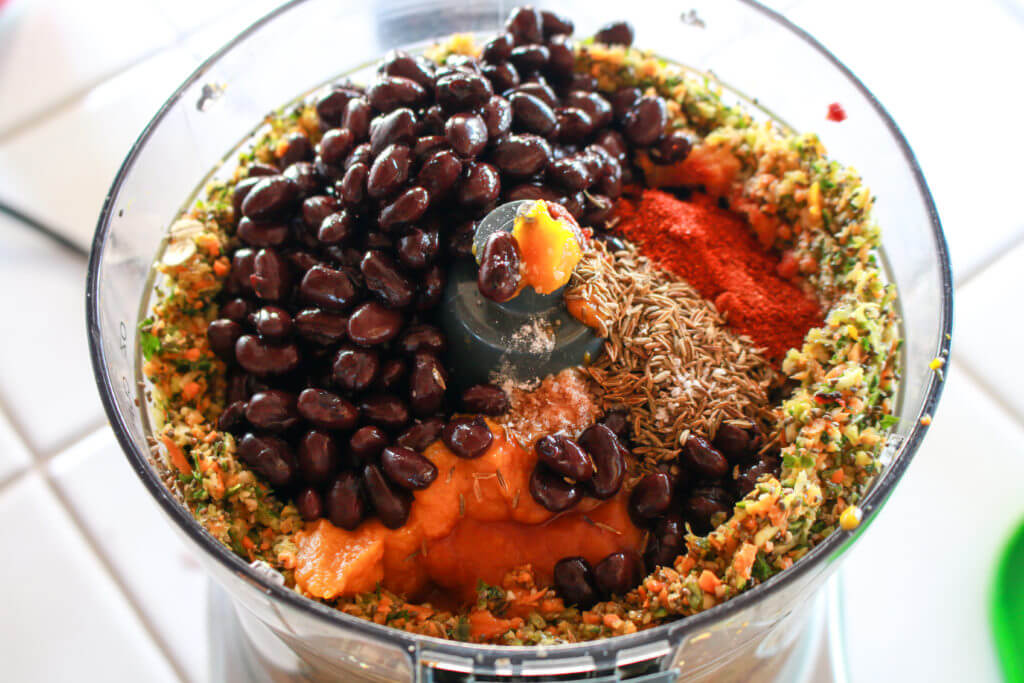 - Add oats, tomato paste, onion powder, cumin seeds, paprika, soy sauce, pumpkin, and black beans to the food processor (along with the ingredients in step 1), and process briefly, just until well combined. May need to pause and scrape down sides. Do not over process—mixture should be combined and ground, but not liquefied. (If you don’t use a food processor, add oats, tomato paste, onion powder, cumin seeds, paprika, soy sauce, and lightly mashed black beans to the mixed bowl, along with ingredients in step 1.)