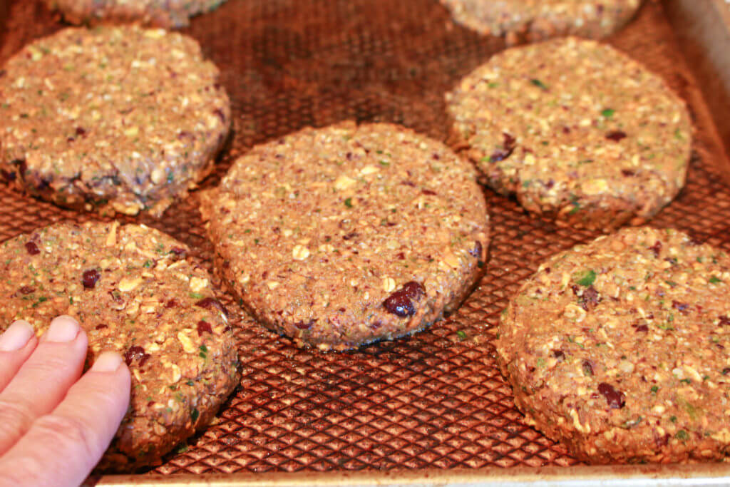- Remove mixture from refrigerator and fill a one-half cup measuring cup with veggie burger mixture, patting down firmly. Invert the filled measuring cup onto a baking sheet sprayed with non-stick cooking spray. Repeat, making 8 burgers. Pat each down to shape a burger about 1-inch thick.