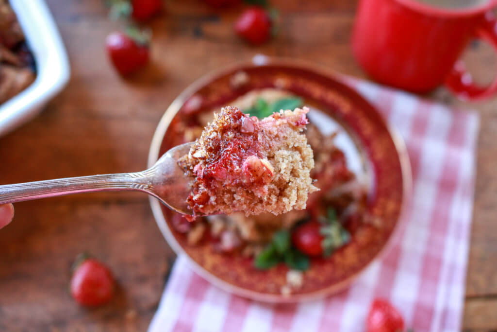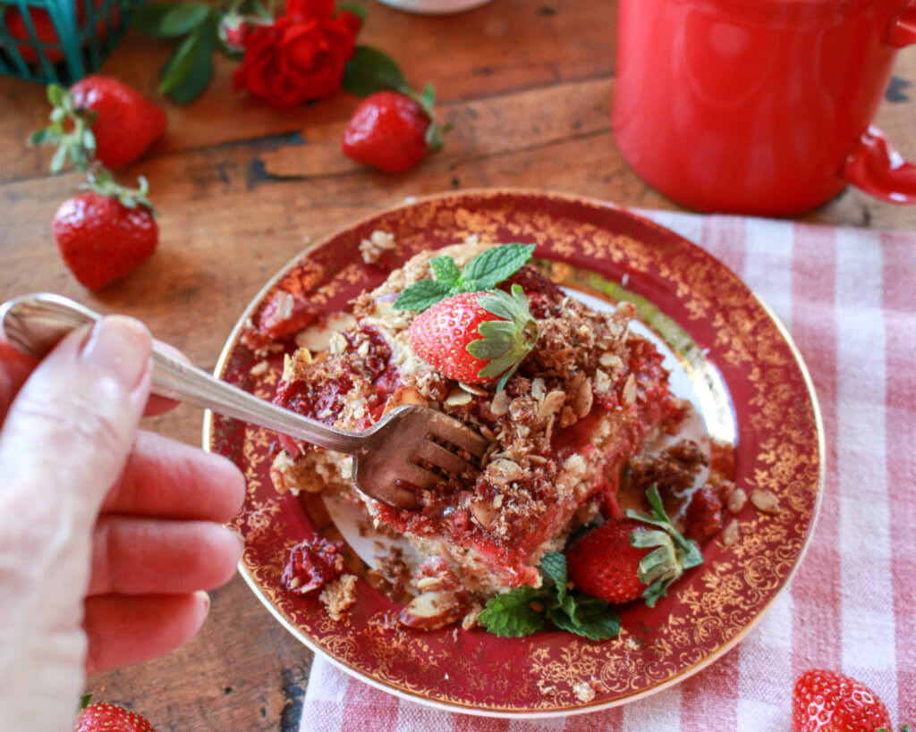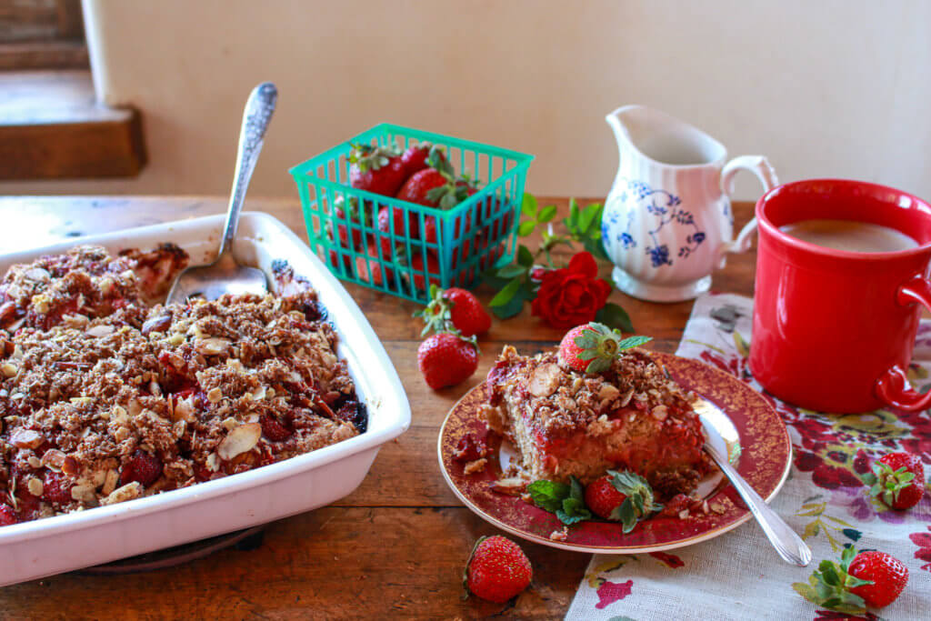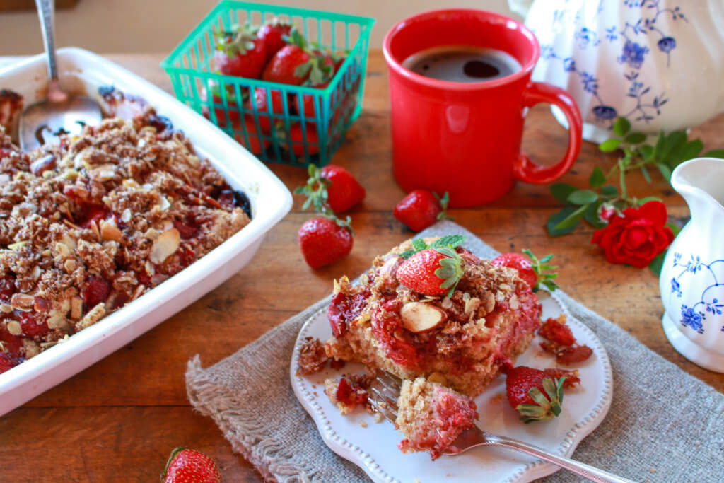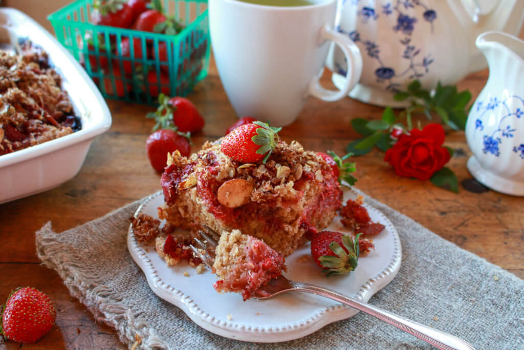 Strawberries offer natural sweetness and flavor to this simple, delicious vegan coffee cake, which is light in sugar and fat, and packed with whole grain goodness. You can make this Coconut Almond Strawberry Coffee Cake gluten-free with a couple of easy swaps.
