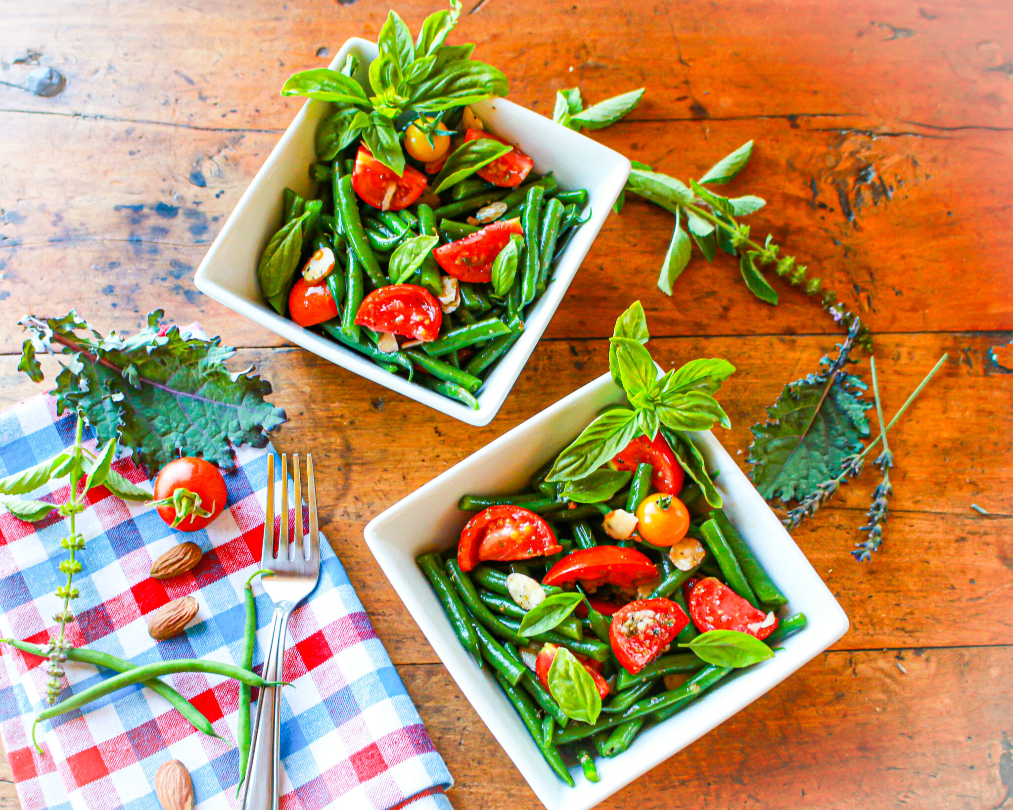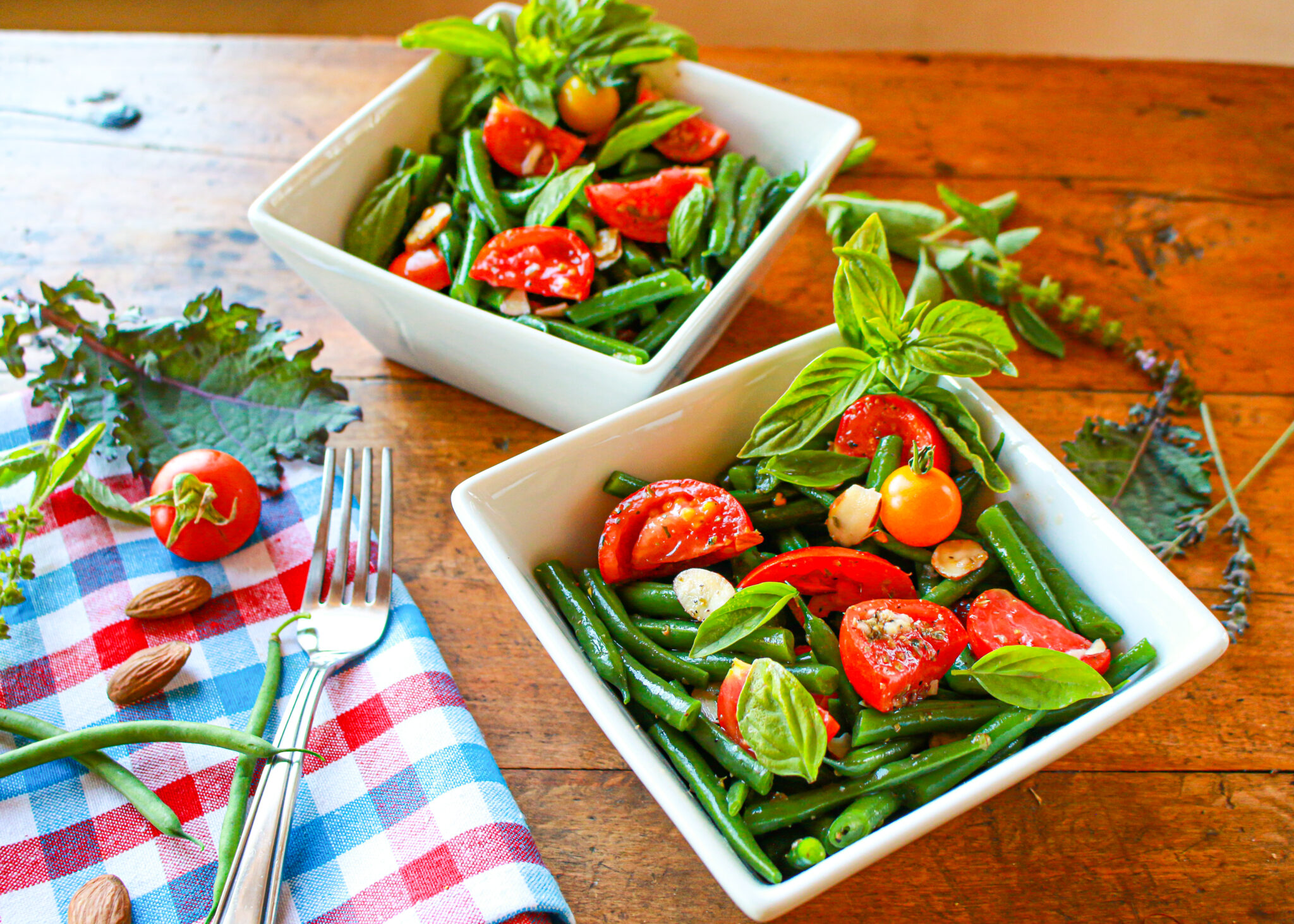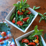 I love this Green Bean Tomato Salad recipe, as I think it is pure summer. It celebrates all of the ripe, abundance of just harvested green beans and vine-ripened tomatoes—fresh from your garden, CSA, farmers market or neighborhood grocer. I have green beans, basil, and tomatoes growing in my garden, and I turn to this easy salad idea all summer long. You can whip it up in mere minutes, and serve it at room temperature or chilled as an accompaniment for a warm weather dinner or picnic. It’s filled with fiber, antioxidant compounds, and vitamins, all in a low-calorie package.