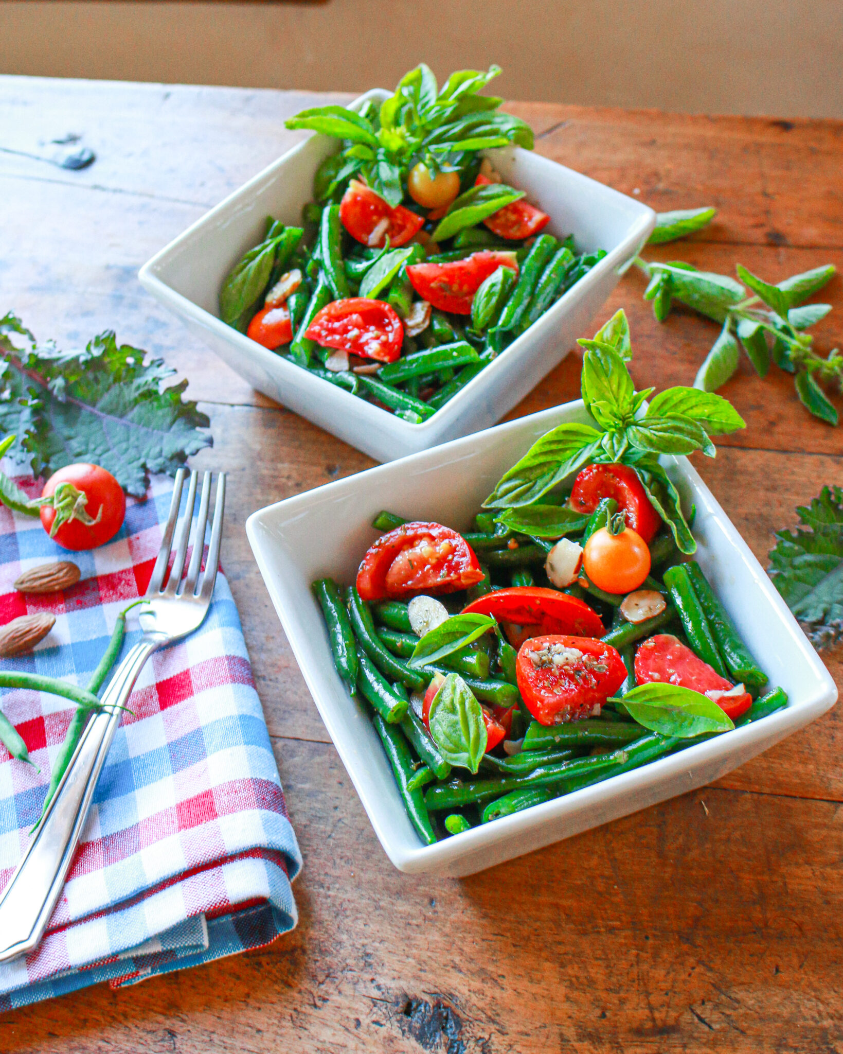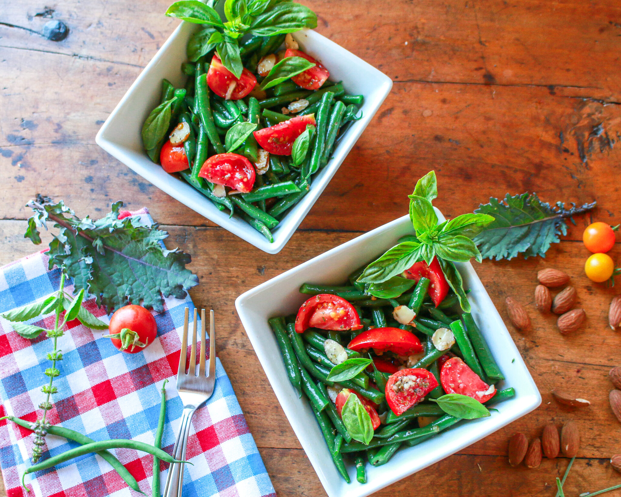 In a medium bowl, mix together cooked, cooled green beans, diced tomatoes, almonds, and fresh basil.
