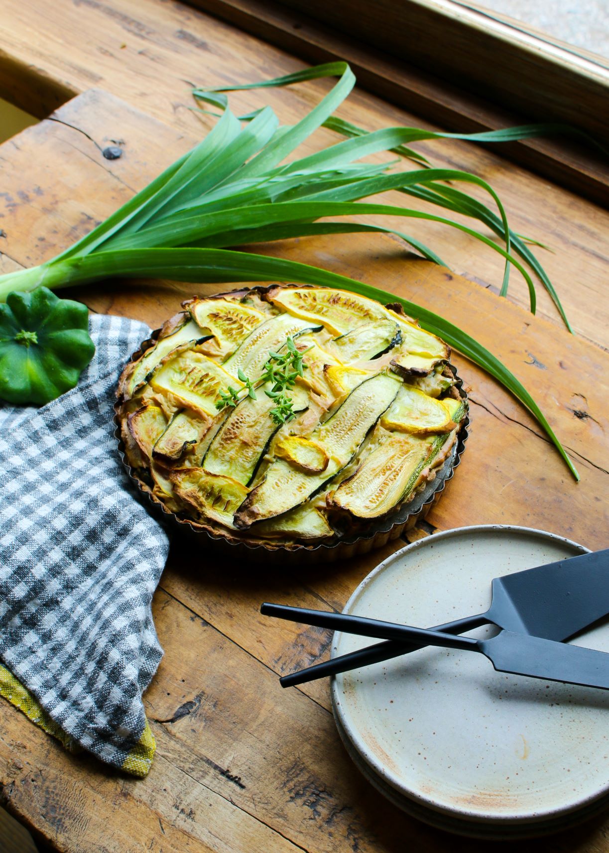 Make this delicious, vegan Summer Squash Lattice Tart—a crunchy whole grain crust filled with a cashew cream leek filling topped with a lattice pattern of yellow and green zucchini—as a healthy brunch, picnic, or dinner recipe.