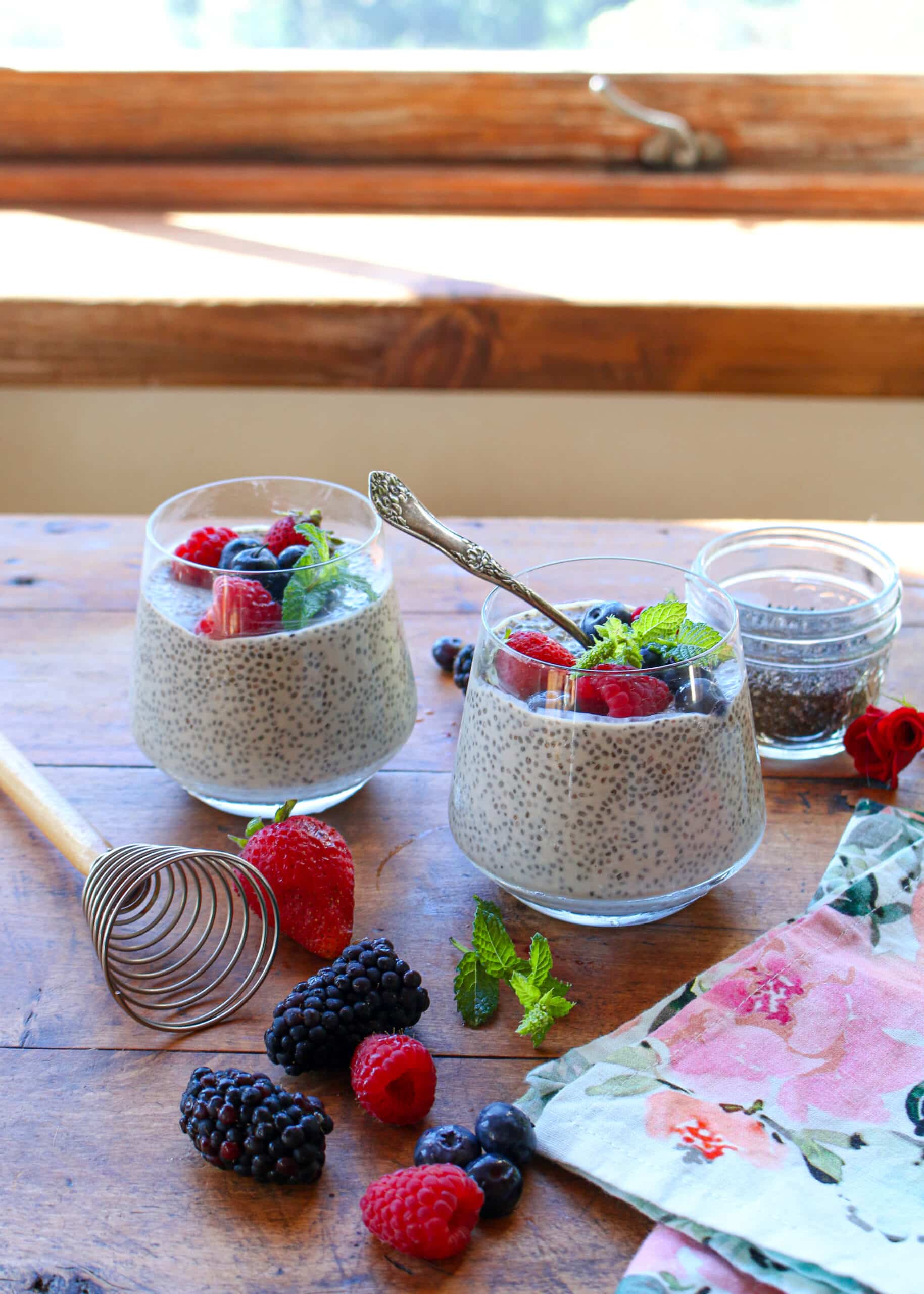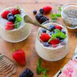 - Cover and refrigerate for about 8 hours, or until achieves desired thickness. (Try chilling overnight). For best results, remove from refrigerator and vigorously stir pudding with a whisk a couple of times during this period. The chia gels will swell and make a thick mixture; stirring occasionally will help make a smooth consistency and avoid settling of the seeds. When pudding is thickened, divide into 6 serving dishes, and top each with ½ cup berries. Alternatively, you can immediately pour the chia seed pudding into into individual serving bowls or glasses to thicken, such as covered mason jars, so that they are easy to grab and go. Then top with berries.