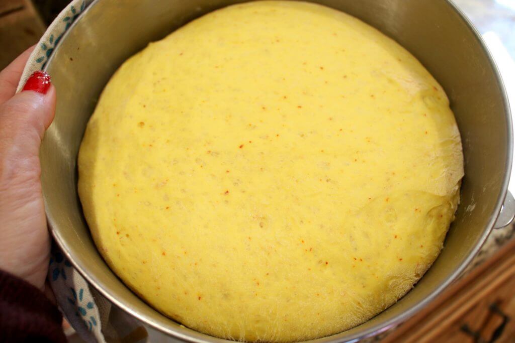 - Add 5 cups of flour, yeast, and the warm liquid from the pot to the bowl. Use an electric mixer and blend well. Add additional flour, ¼ cup at a time, until you achieve a soft dough that is not sticky to the touch (avoid too much flour so that it isn’t too dry). Place some of the remaining flour on a clean surface. Remove the dough from the bowl and knead on the floured surface for 5 minutes.