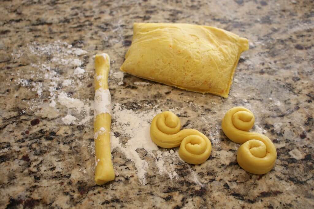 - Remove the dough, divide it into smaller sections, and roll the dough into ropes about 1-inch in diameter. Cut the ropes into 8-inch lengths. Shape into curled rolls (see photo).