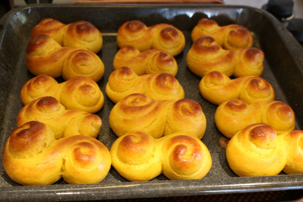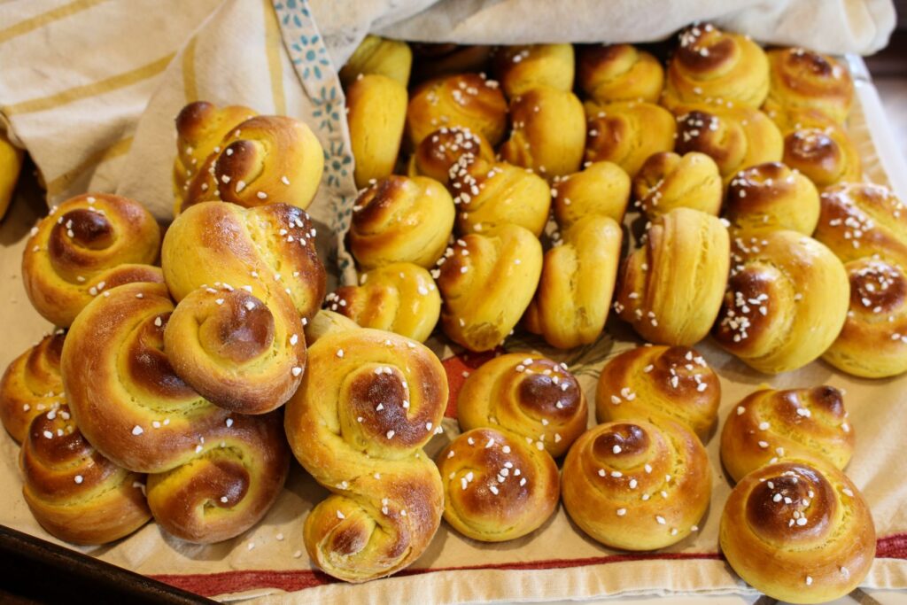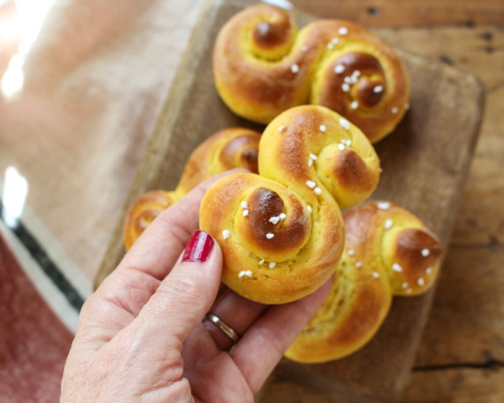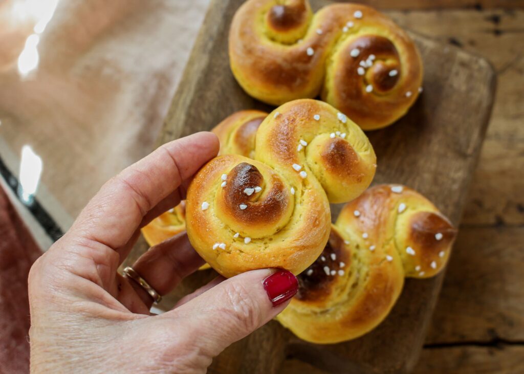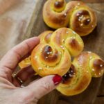 These classic yeasty, vegan Swedish Saffron Rolls—filled with the golden aromas of saffron—are traditionally served in Sweden during the holidays.