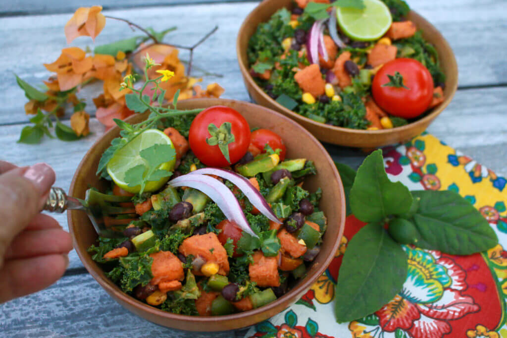 - When cool, add avocado, tomatoes, corn, beans, onion, bell pepper, cilantro, and kale to cooled potato mixture, combining gently.