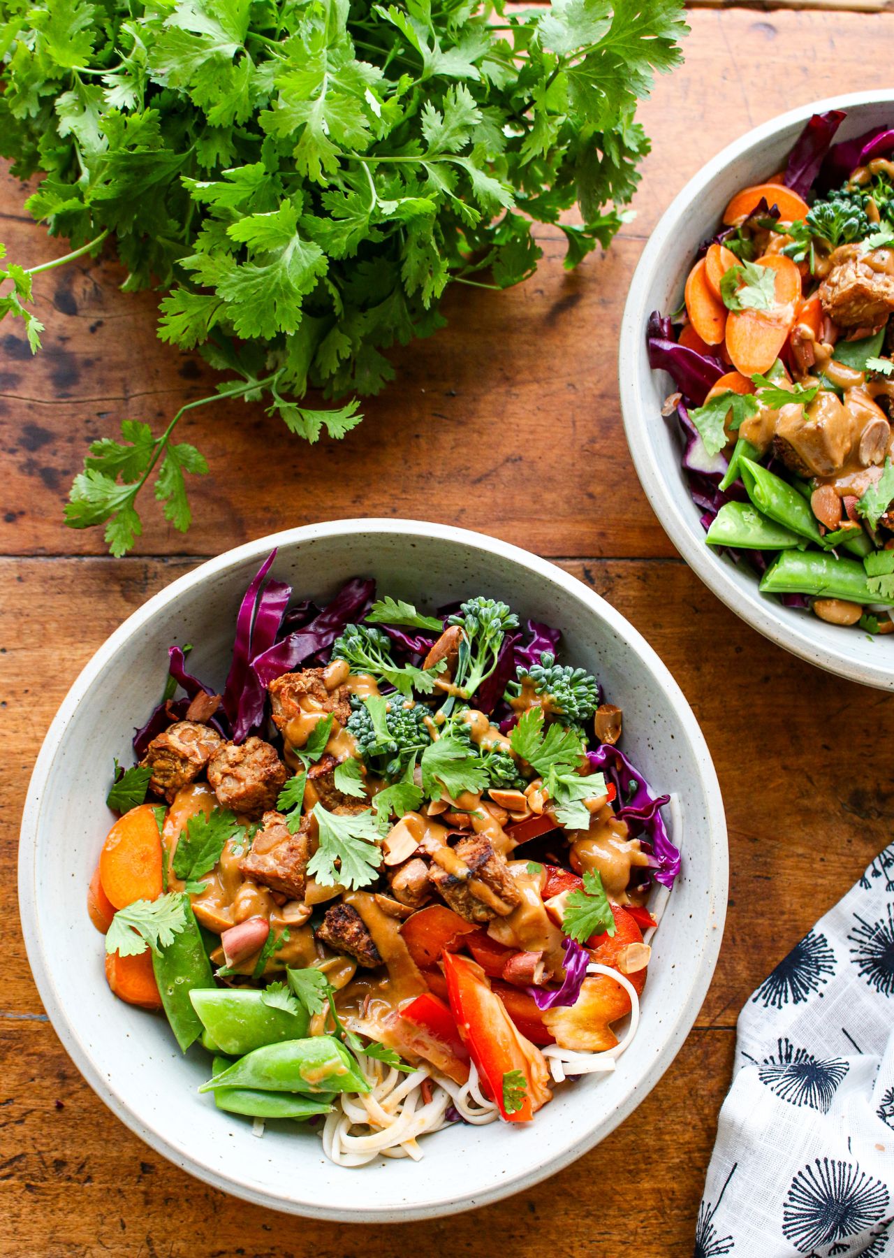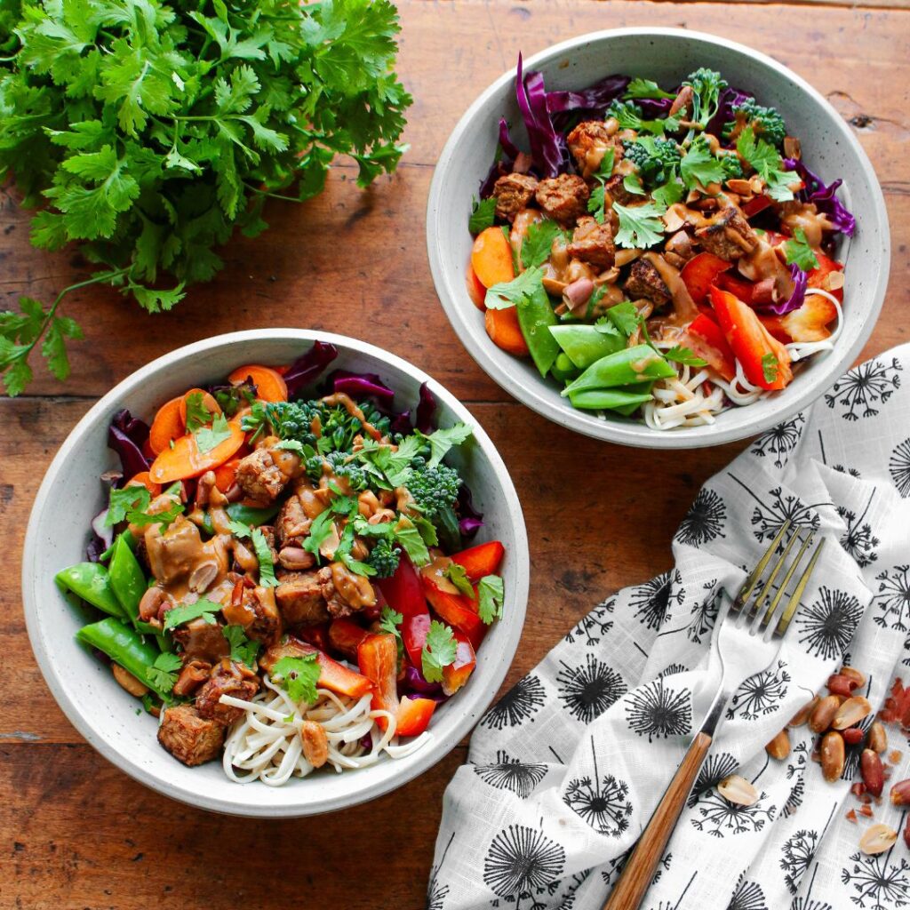 While tempeh and noodles are cooking, prepare the other salad ingredients. In a large mixing bowl, add cabbage, carrots, broccoli, snap peas, cilantro, and peanuts. Add cooked and cooled tempeh and noodles.