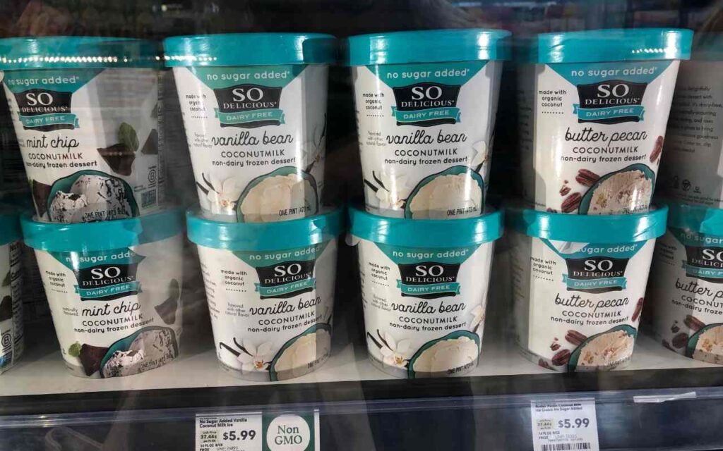 Another thing to watch out for is the addition of added sugars, such as sugar, maple syrup, corn syrup, and agave. Often dairy free ice creams contain just as much sugar as regular, dairy-based ice creams. Some, however, only rely on the natural sweetness of fruit! Check out the nutrition facts label, which will list added sugars, added fat and saturated fat, and calories per serving.