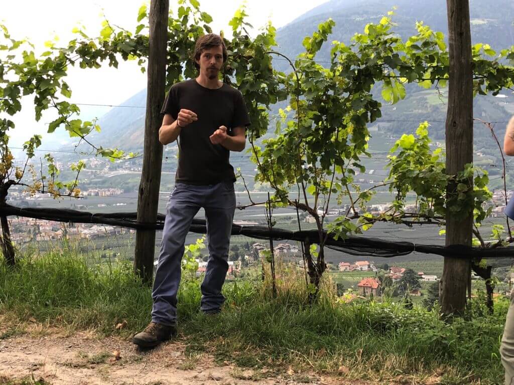 Nik—great grandson of Pound—runs the farm at Brunnenburg. He also makes the wine, beer, spirits, and cooks! Here is giving a tour of the vineyards, which are based on disease resistant varieties that are not sprayed with pesticides.