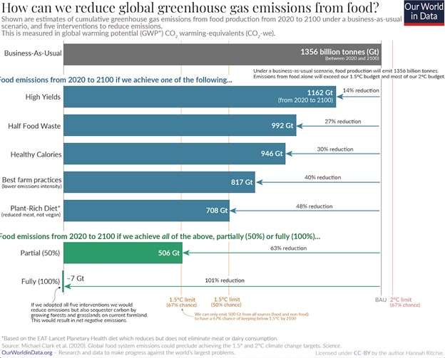 Over the past few decades, it’s become increasingly clear that what we choose to put on our plates every day is one of the most significant opportunities we can have as individuals over our lifetimes to reduce our environmental impact. Our diets make big impacts on deforestation, pollution, water use, and greenhouse gas emissions (or carbon), which impacts climate change. According to the IPPC, we must stay within 1.5 °C above pre-industrial levels in order to avoid disastrous and irreversible impacts on climate change on our big beautiful planet. If we keep a “business as usual” model, we will exceed this climate budget by 2100 just from food alone! That’s not factoring in other big contributors, such as energy and transportation.