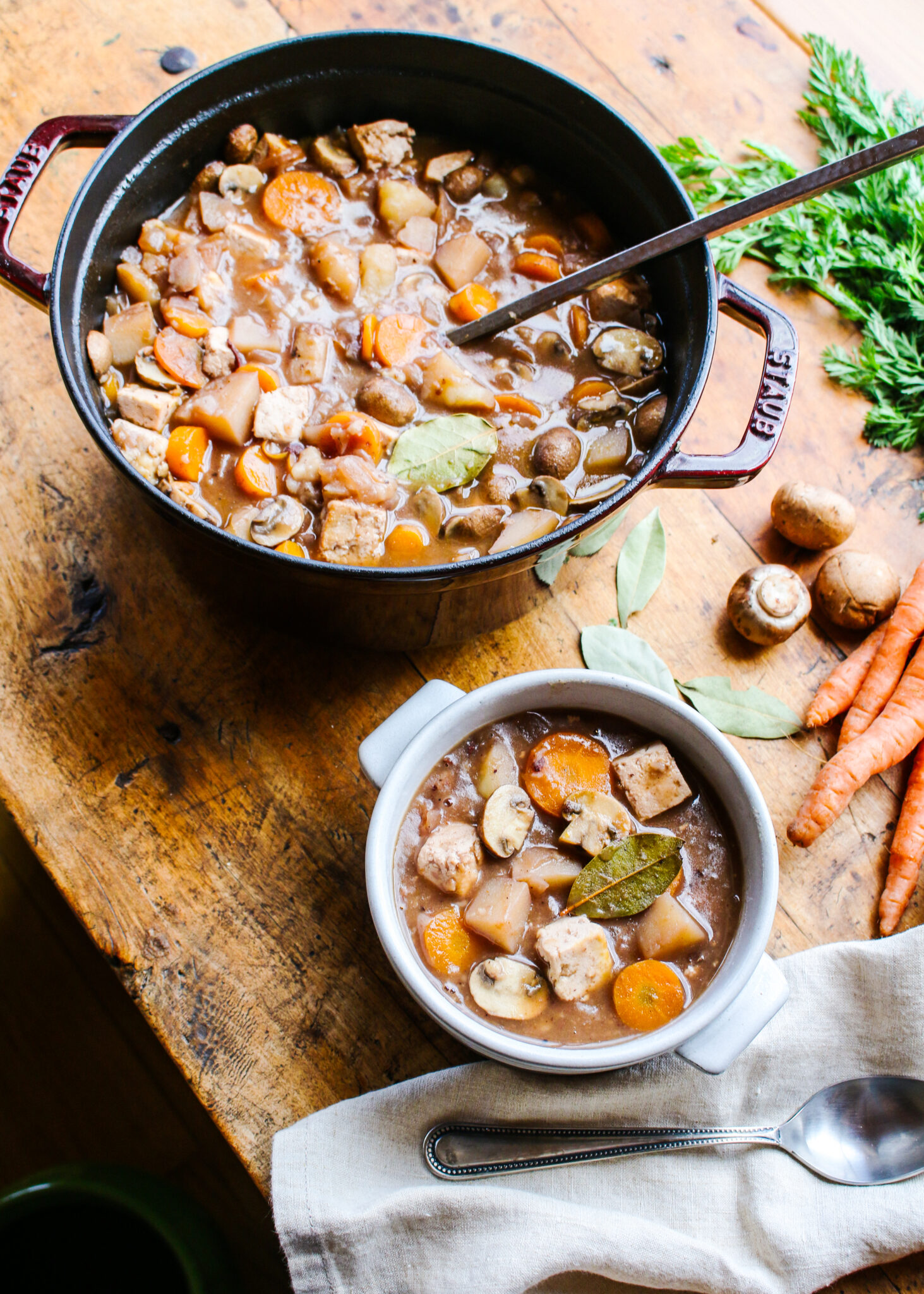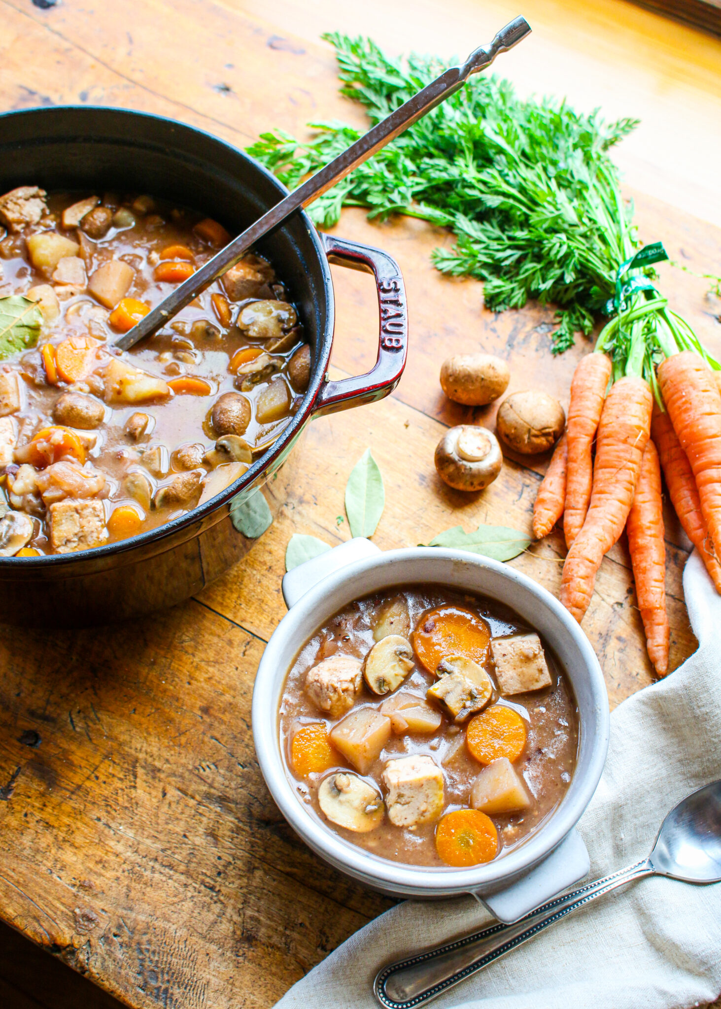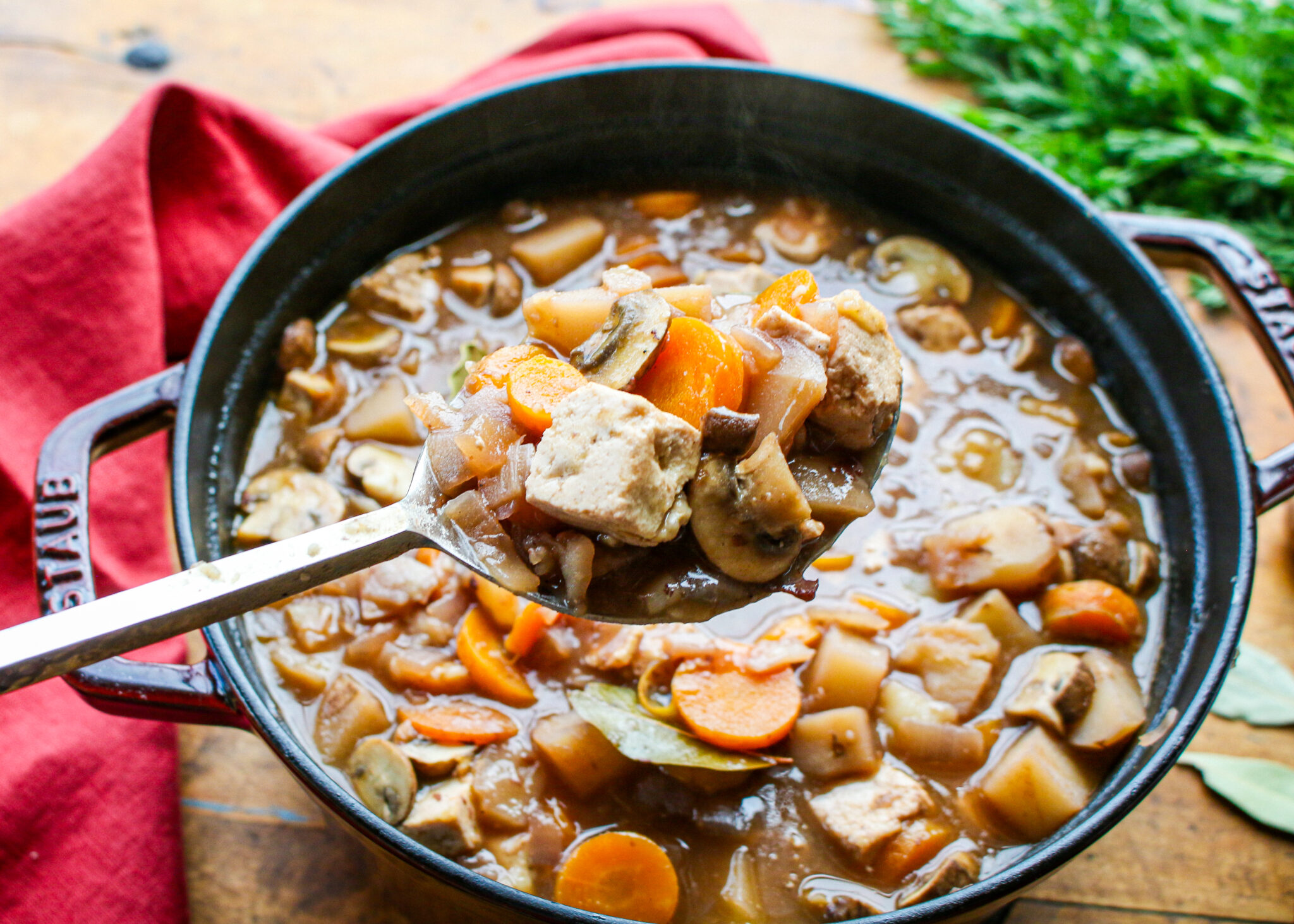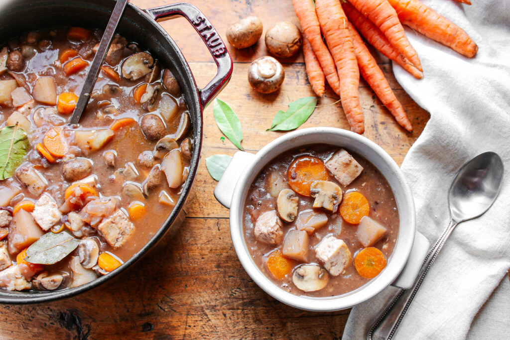 I love to serve this vegan and vegetarian beef bourguignon recipe with my homemade biscuits or a crusty loaf of French bread. It’s perfectly warm and satisfying on cooler nights, but I also enjoy it year-round! Featuring simple ingredients, like flour, vinegar, red wine, soy sauce, potatoes, carrots, and onions that you may have at home right now, you can get this easy comforting stew on the table in under an hour, but it will look like you’ve been working hard in the kitchen all day! You can easily make it gluten-free by swapping out the flour with corn starch.