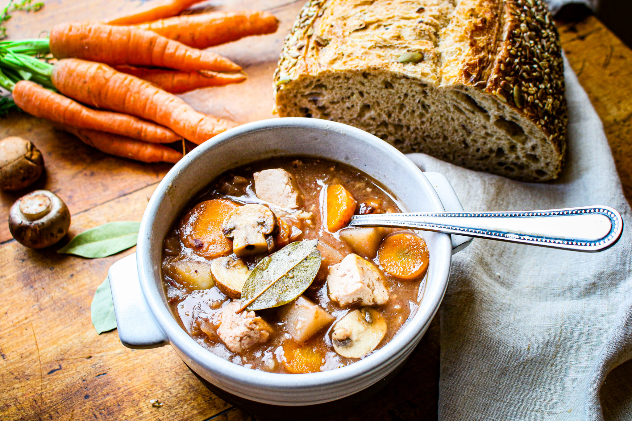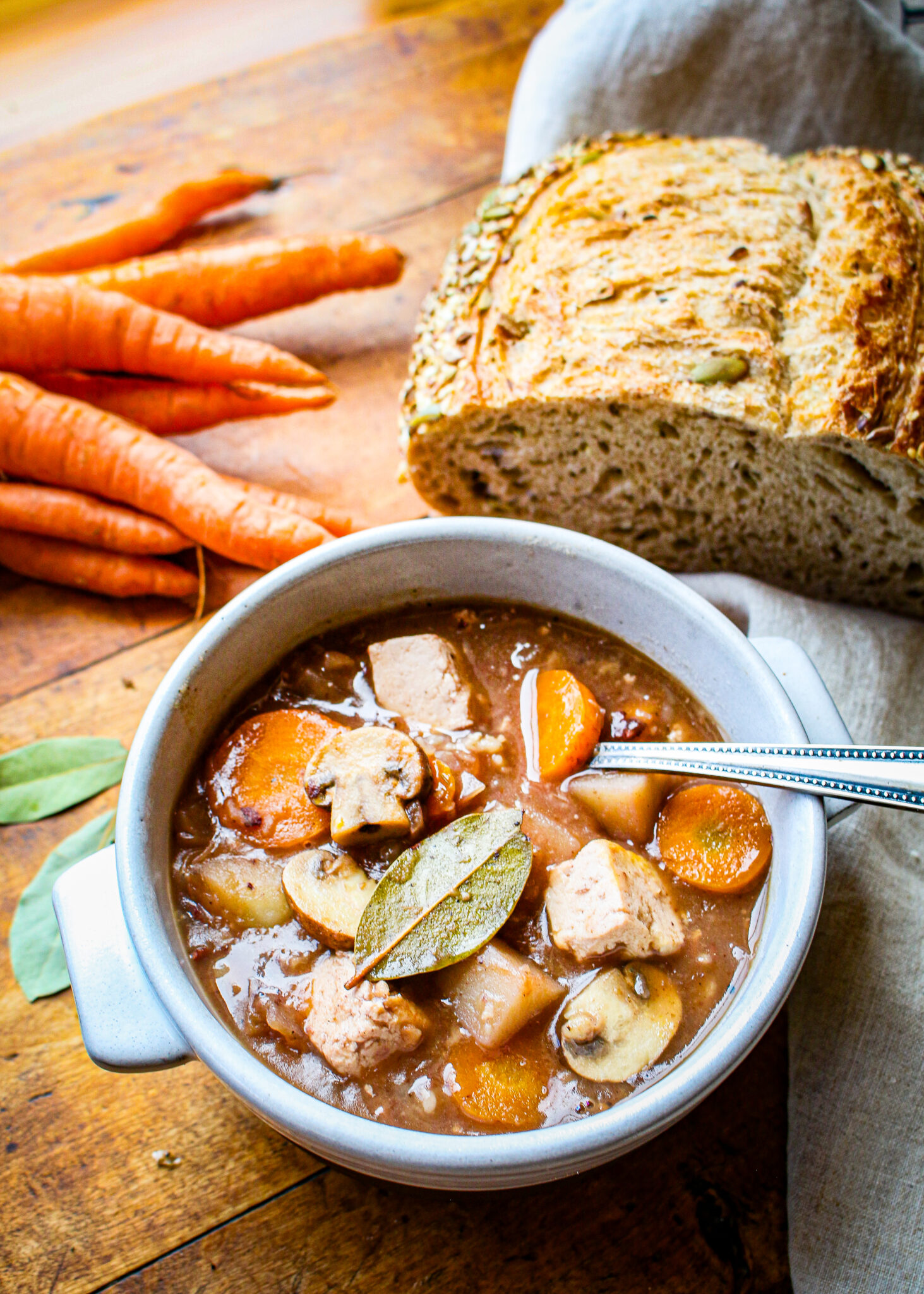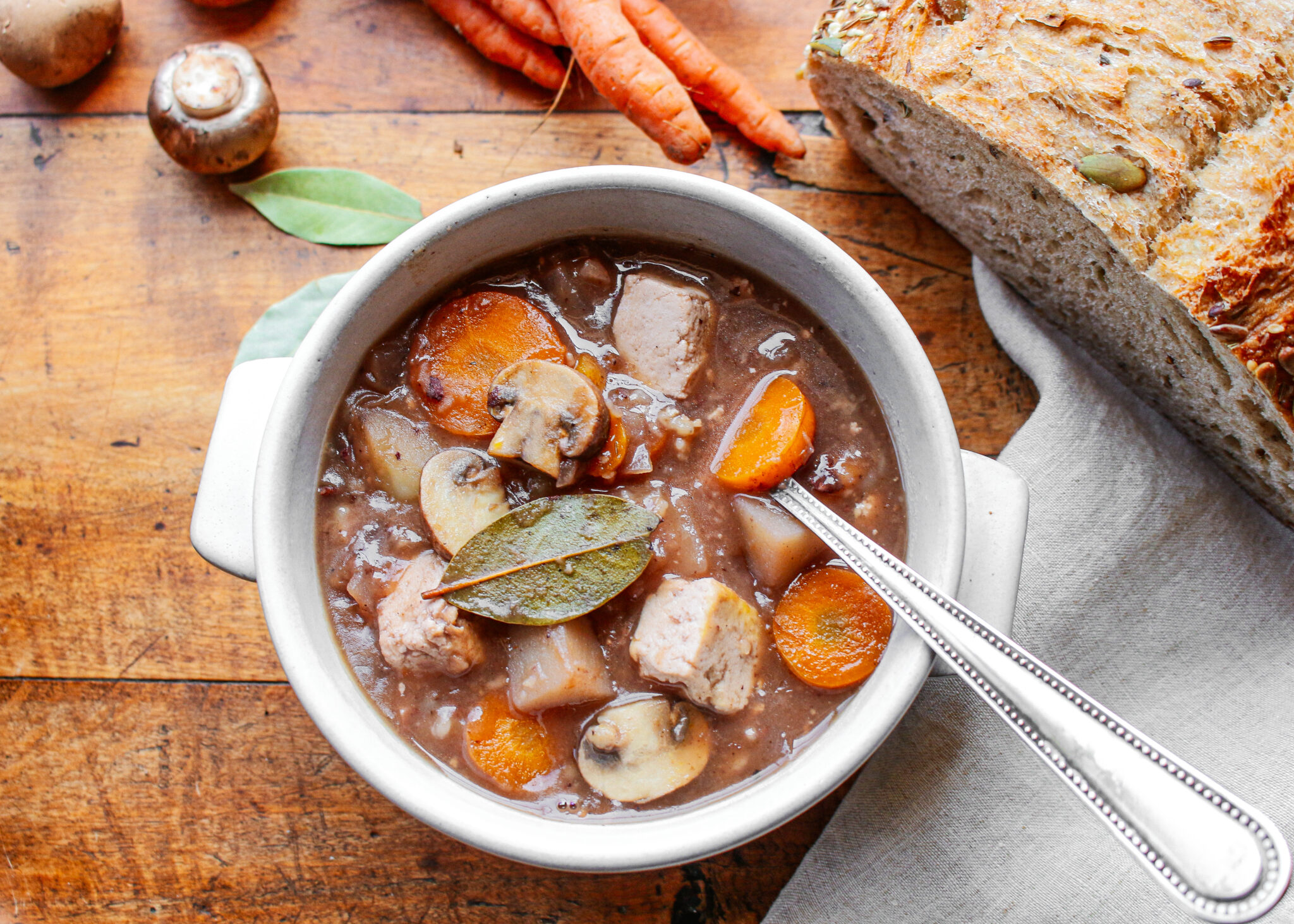 I love to serve this vegan and vegetarian beef bourguignon recipe with my homemade biscuits or a crusty loaf of French bread. It’s perfectly warm and satisfying on cooler nights, but I also enjoy it year-round! Featuring simple ingredients, like flour, vinegar, red wine, soy sauce, potatoes, carrots, and onions that you may have at home right now, you can get this easy comforting stew on the table in under an hour, but it will look like you’ve been working hard in the kitchen all day! You can easily make it gluten-free by swapping out the flour with corn starch.