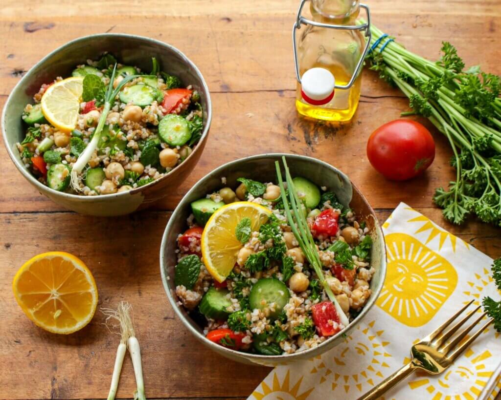 Here’s a fun, hearty twist on a classic tabbouleh. Whip up this recipe the next time you cook Middle Eastern food, such as falafels, hummus, or grilled eggplant. Or even serve it as a rustic side dish for veggie-burgers or vegetable soup. Make it gluten-free by substituting a gluten-free grain.