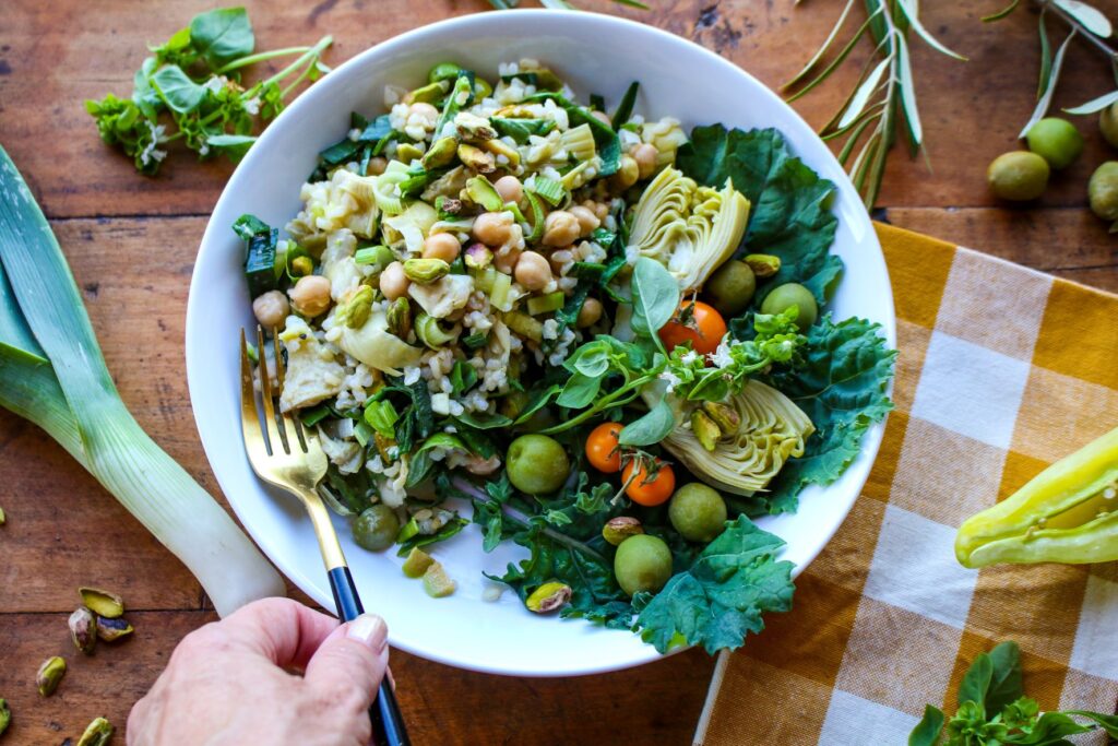 The contrast of green, verdant colors and sunny, golden shades—as well as vibrant flavors and textures—of this easy plant-based salad really shine. Based on cooked brown rice, and the Mediterranean ingredients chickpeas, yellow bell pepper, leeks, artichokes, basil, and pistachios, this filling salad has intriguing tastes and health benefits. A touch of healthy fats, lemon juice and herbs provides for a delicious, light vinaigrette. Rich in fiber, plant protein, vitamins, minerals, and phytochemicals, this offers a great nutrition punch to your day.