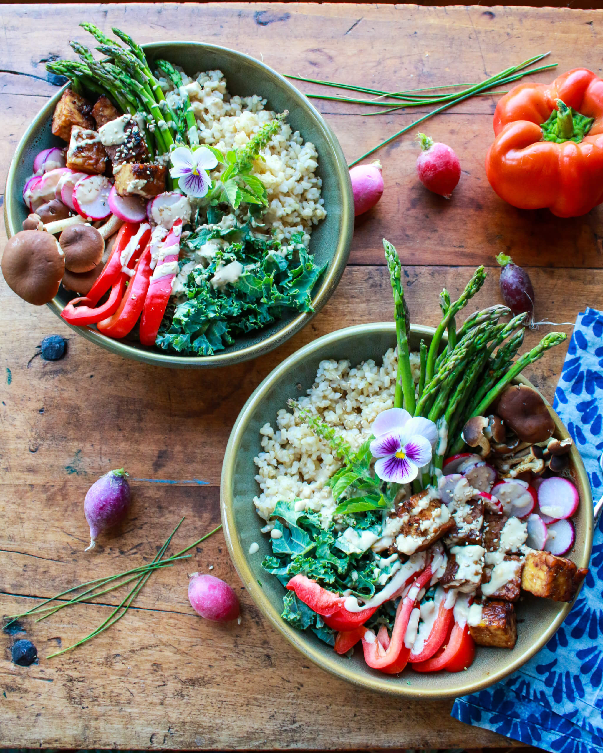This satisfying vegan grain bowl is filled to the brim with tempeh, brown rice, crunchy radishes, baby kale, asparagus, mushrooms, and peppers, with a topping of tahini ginger dressing for bold flavor. All for a powerful contribution of 25 grams of protein per serving.