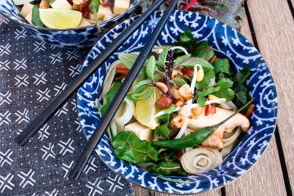 This Vegetable Tofu Pho is a super easy flavorful, nutritious noodle soup based on the cultural food traditions of Vietnam. This recipe is vegetarian, vegan, and can be made gluten-free. Plus, it’s packed with 28 grams of protein per serving.