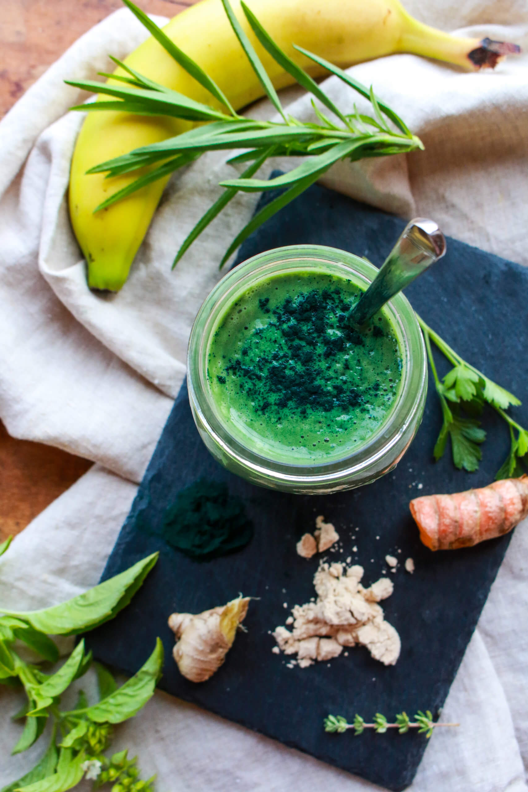 This super wholesome High Protein Super Green Smoothie, with 30 grams of protein per serving, is filled with antioxidant and anti-inflammatory ingredients, including ginger, turmeric, fruit, and green powder.