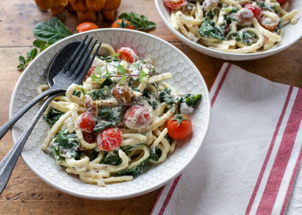 Make the creamiest, heartiest, easiest vegan pasta with a creamy spinach ricotta sauce ever in just 20 minutes with a few key ingredients—pasta, spinach, tomatoes, shallots, garlic and vegan ricotta. You’ll get the reward of 19 grams of protein per serving, too!