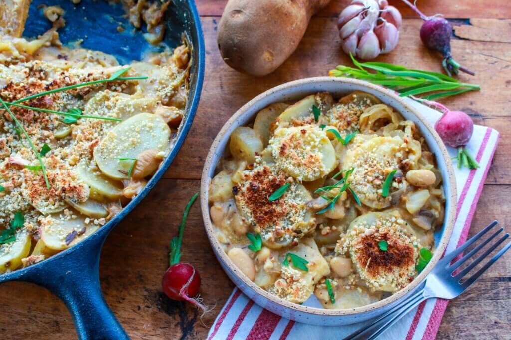 Cozy up to this delicious,100% plant-based scalloped potato white bean skillet recipe (cook it and serve it in one skillet), which highlights the comforting versatility and satisfaction of whole potatoes, cooked with onions, garlic, mushrooms, and white beans, served with a non-dairy creamy sauce, and crunchy cashew and parsley topping. Comfort food with 20 grams of protein per serving!
